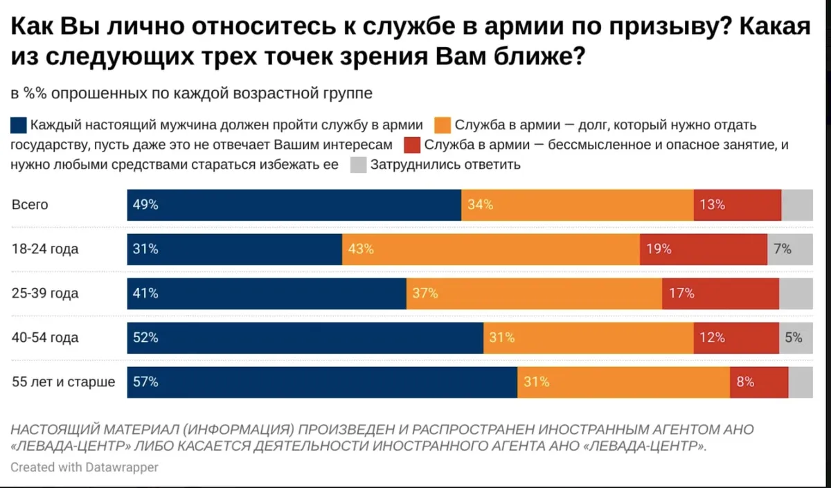 Наименьшая поддержка идеи служить в армии видна среди самых молодых (19%), тех, кому едва хватает на еду (14%), жителей Москвы (24%) и опрошенных, доверяющих альтернативным источникам информации — соцсетям, Интернет-изданиям и Telegram-каналам (около 20%).