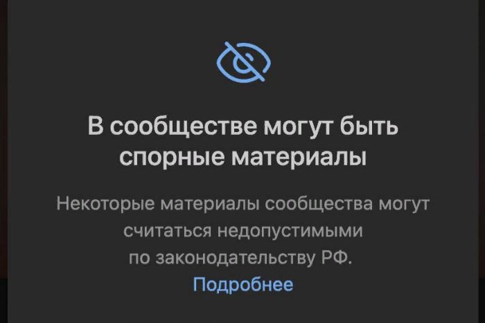 При входе в некоторые сообщества теперь появляется дисклеймер с надписью «В сообществе могут быть спорные материалы» и предупреждением, что «некоторые материалы сообщества могут считаться недопустимыми по законодательству РФ».