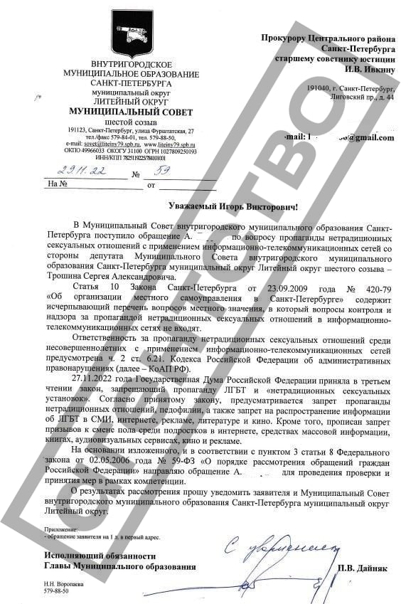 Детали. Заявление написано 29 ноября, то есть за шесть дней до того, как президент подписал новый закон о запрете «пропаганды ЛГБТ». При этом, заявитель ссылается именно на этот закон, который на момент заявления был еще только принят Госдумой. Глава «Литейного», единоросс Павел Дайняк сообщил в прокуратуру, что к нему поступило обращение о том, что Трошин занимается «пропагандой нетрадиционных сексуальных отношений с применением с применением информационно-телекоммуникационных сетей». Фамилия обратившегося в тексте замазана. Дайняк просит прокуратуру провести проверку и принять меры.
