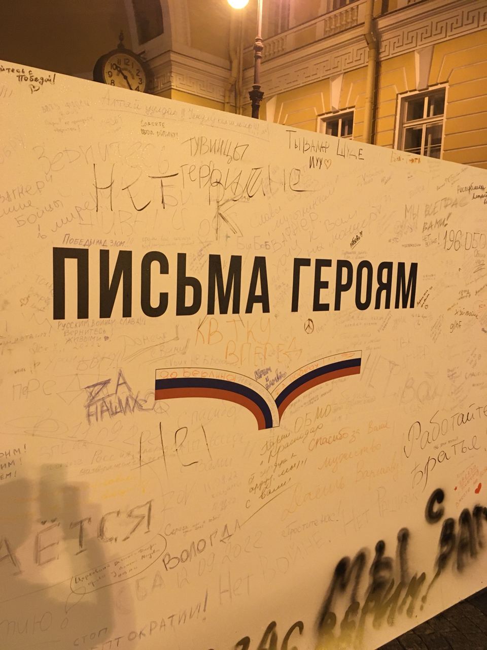 Сама девушка живет в Петербурге. Она прислала «Медиазоне» фотографии почтового ящика на Дворцовой площади, где собирают письма для военных. На стенде, к которому прикреплен ящик, оставляют как слова поддержки, так и надписи «Нет войне».
