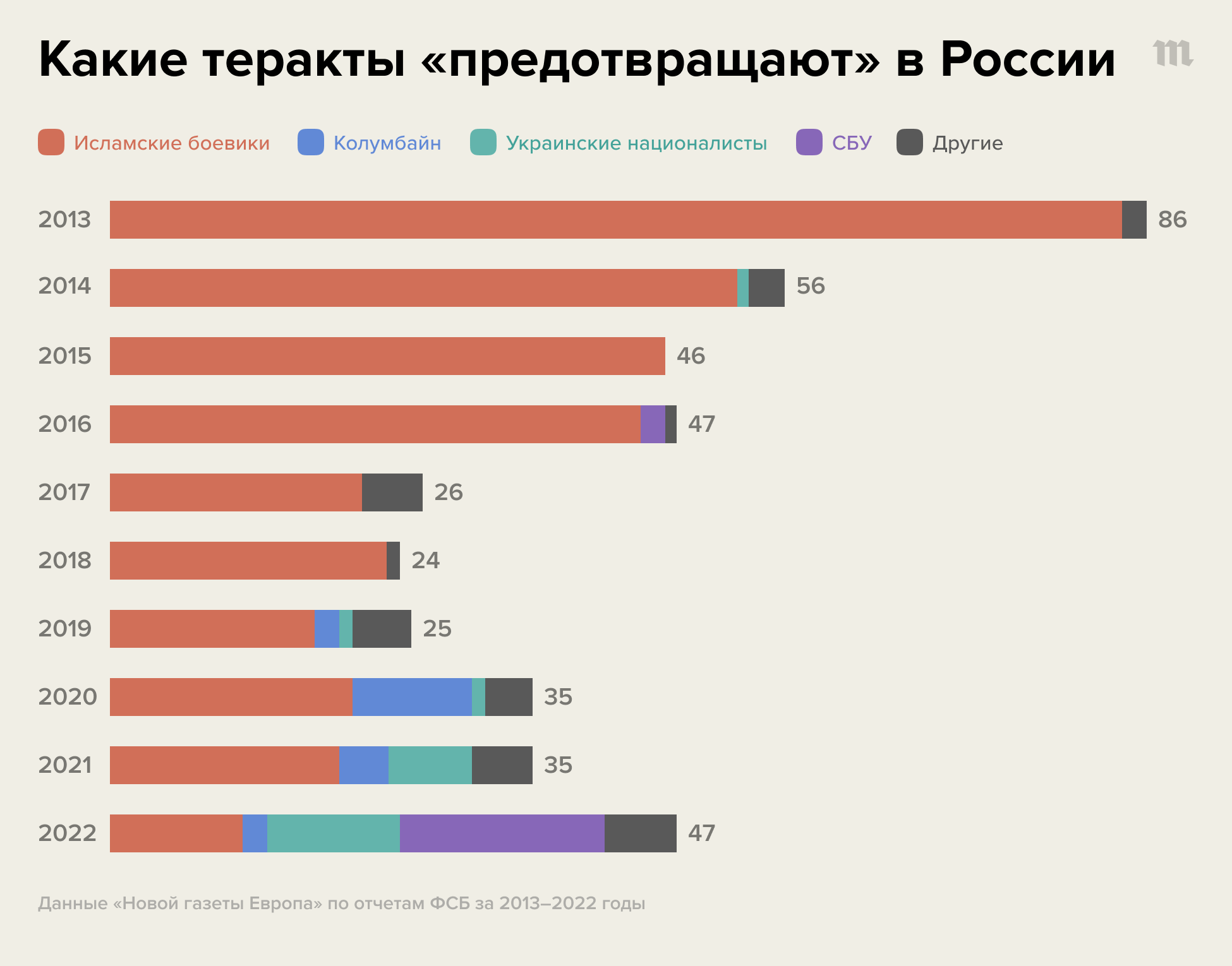 Если в начале 2010-х спецслужбы «предотвращали» теракты только в среде «исламистского подполья», то к концу десятилетия на смену таким терактам пришли «колумбайны» (10 «предотвращенных» терактов в 2020 году, когда из-за ковида школьники находились на дистанционном обучении), а затем преступления, приписываемые СБУ и «украинским националистам» (17 и 11 «предотвращенных» терактов в 2022 году соответственно).