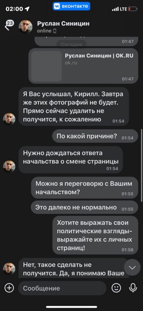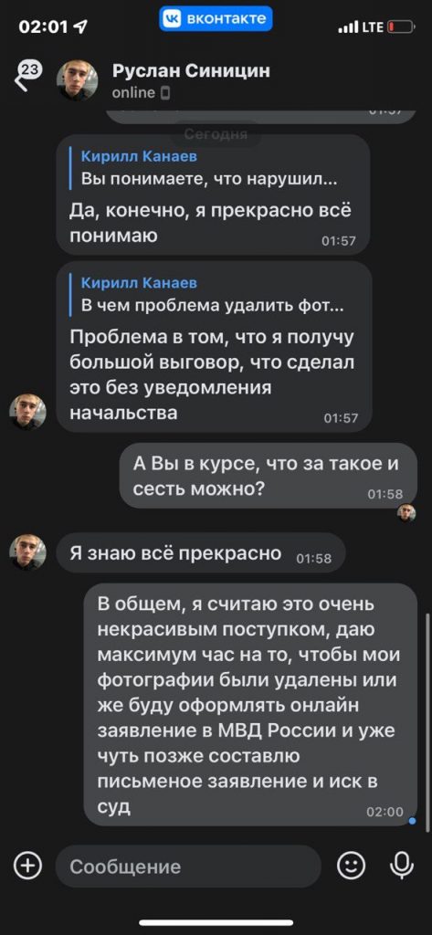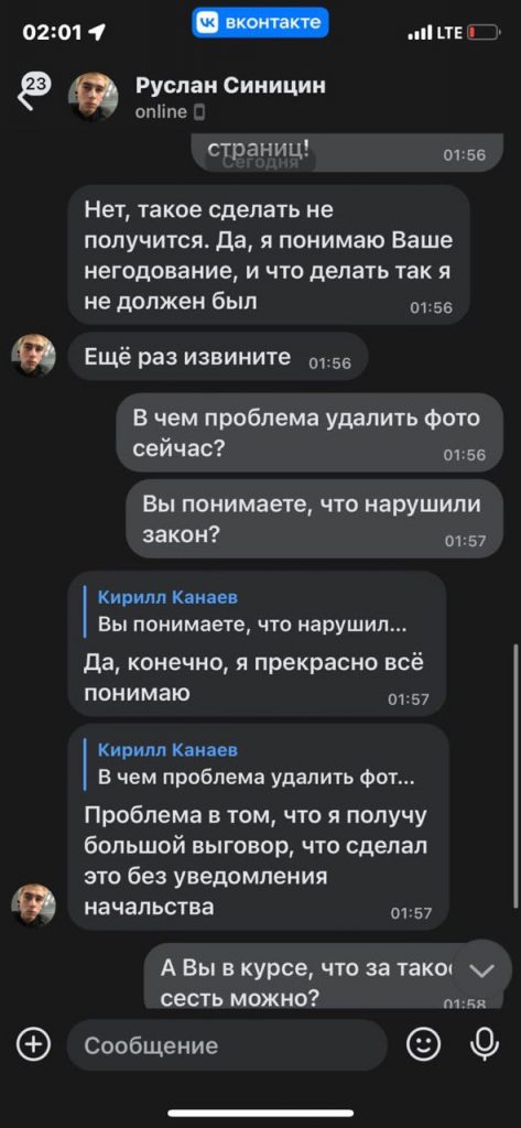 Ответ он получил только во «ВКонтакте» (орфография и пунктуация сохранены). «Теперь уже, раз Вы нашли эту страницу, хочу попросить оставить все как есть, и не удалять ваши фото. Извините», — через пару часов написал «Руслан Синицин», пояснив, что фото ему нужны для работы, хотя это его, «конечно же, не оправдывает». Канаев не согласился и потребовал удалить снимки. «Я вас услышал, Кирилл», — ответил неизвестный и пообещал, что «завтра же» уберет фото. Снять их сразу он отказался, потому что «нужно дождаться ответа начальства, иначе будет выговор».