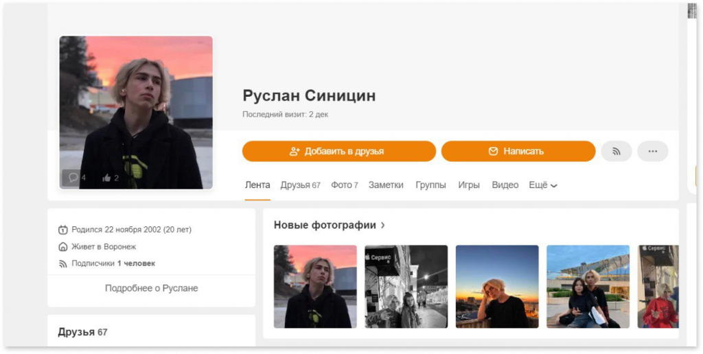 Ночью с 5 на 6 декабря Канаев решил проверить свой старый профиль в «Одноклассниках»: на страницу он заходил редко, держал ее только для того, чтобы время от времени общаться с дальними родственниками. Неожиданно в списке рекомендованных друзей Канаев увидел аккаунт «Руслана Синицина» со своей фотографией на аватарке. «Сначала я подумал, что сайт как-то заглючил, — вспоминает Кирилл в разговоре с “Холодом”. — Зашел в профиль “Руслана”, убедился, что там действительно мои фото, все заскринил и решил написать владельцу аккаунта личное сообщение».