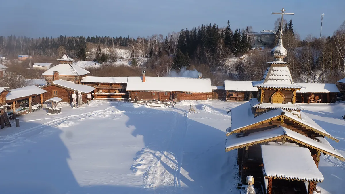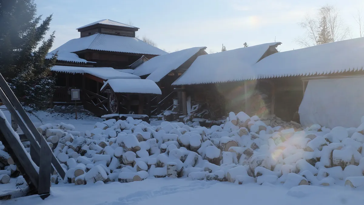 Поначалу увиденное за крепостной стеной показалось мне какой-то позабытой киношниками декорацией. Здесь было всё, как на съемочной площадке: заснеженные копны сена, сделанные из бревен импровизированные мишени для стрельбы из лука, у самого входа — кузница, а в центре острога — самая настоящая деревянная часовня. И просторный жилой дом с уходящим высоко в морозное небо дымком из трубы. Около дома припаркованы машины и снегоходы. Здесь вместе с семьей и ближайшими помощниками и живет Владимир Ильин.