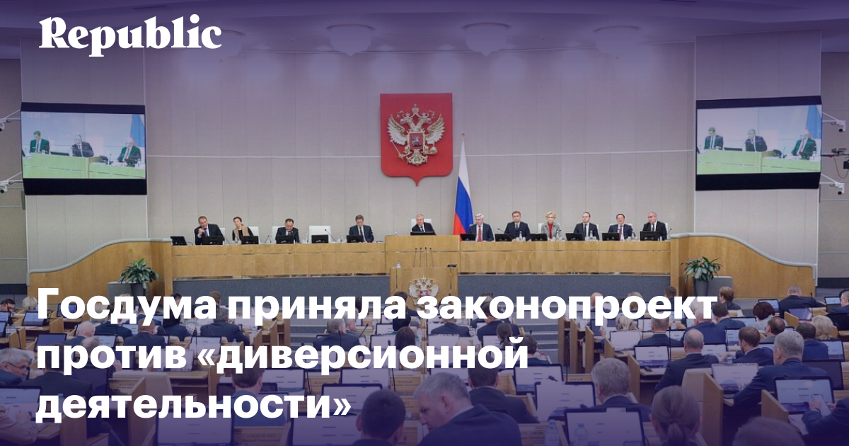 Депутаты Госдумы приняли в первом чтении законопроект, направленный на «защиту страны и граждан от террористической и диверсионной угроз». Наказание для диверсантов и вербовщиков будет максимально жестким — вплоть до пожизненного заключения.