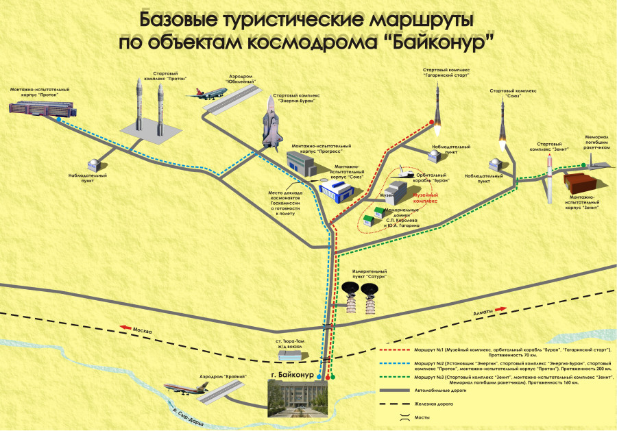 Т. к. Байконур создавался в первую очередь как полигон, то и стартовые площадки расположены друг от друга на огромных расстояниях.