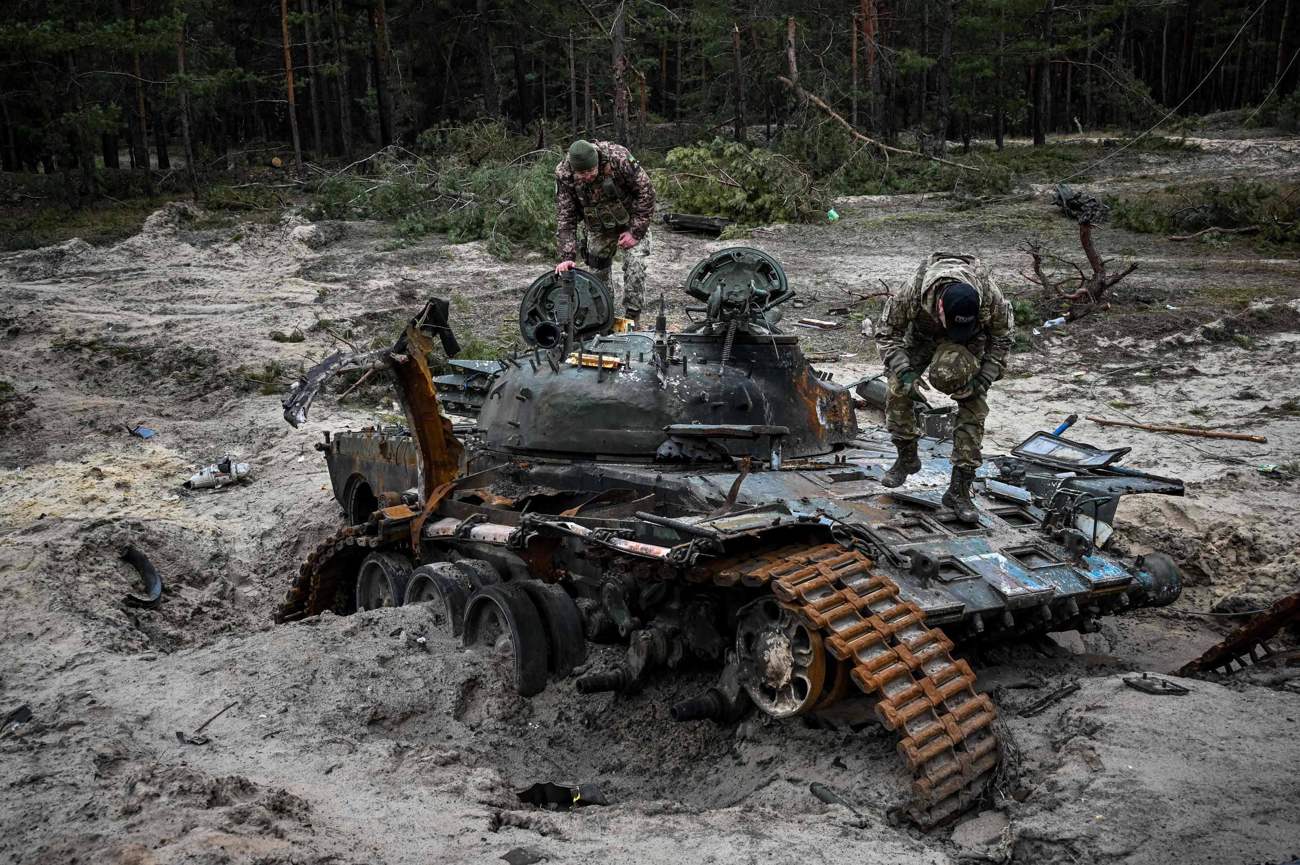 Украинские военнослужащие осматривают подбитый российский танк возле поселка Ковшаровка в пригороде Купянска
