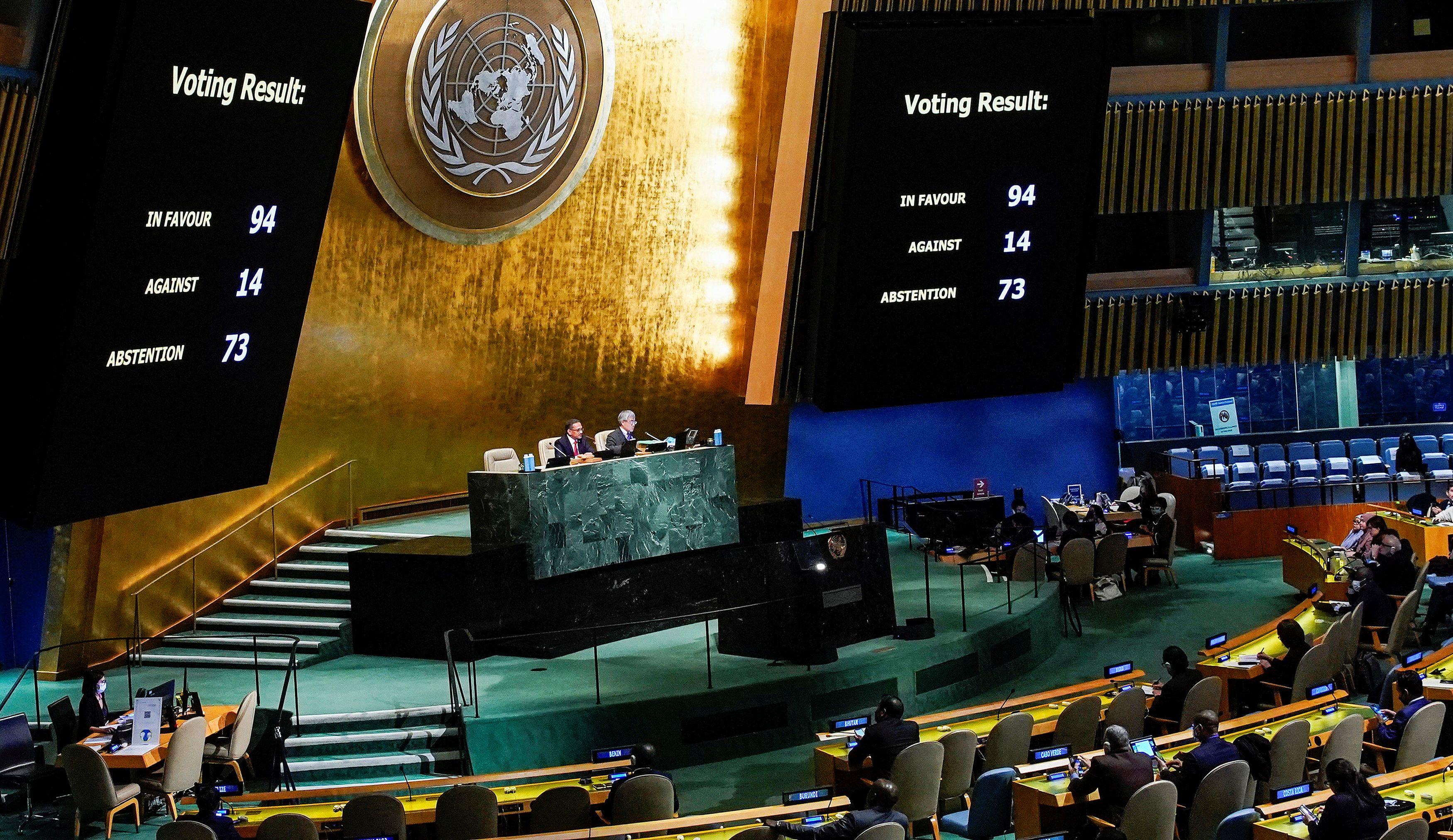 В резолюции говорится, что "вопиющие нарушения" Россией Устава ООН, среди них попытка незаконной аннексии части территории Украины, преступления против мирного населения в Украине, ядерные угрозы и другие действия ставят под вопрос право России на постоянное членство в Совете безопасности ООН.