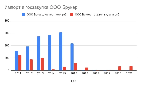 При этом — внимание! — в Москве существовала и дочерняя фирма «Брукера» — ООО «Брукер», однако она практически не ввозила технику: по данным таможенной базы «ИмпортГениус», ООО практически ничего не растамаживало и не становилось подрядчиком по госзаказам. Как видно из графика, который построен по данным таможенной базы «ИмпортГениус» и сайта госзакупок, импорт ООО «Брукер» до 2016 года был небольшим, но все же ненулевым, а затем падает практически в ноль. Участие в госзакупках последние 10 лет падало от небольшого показателя (по сравнению с МТЦ и «Академинторгом») до ничтожного.