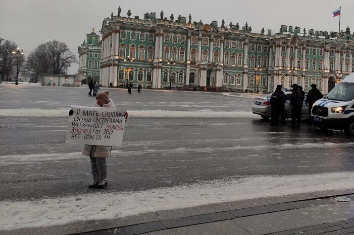 Помимо этого, одна из активисток, Татьяна, встала в пикет с плакатом на Дворцовой площади. Позже вокруг нее начали собираться сотрудники полиции.