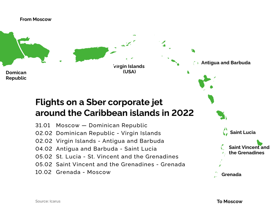 . On the most recent Caribbean tour, Sber’s plane flew routinely from one island to another between January 31 and February 10, 2022. Sberbank has no branches in Ethiopia or the Caribbean islands, nor does it have any publicly known operations there Sber did not respond to Project’s inquiry about the purpose of the exotic tours ×