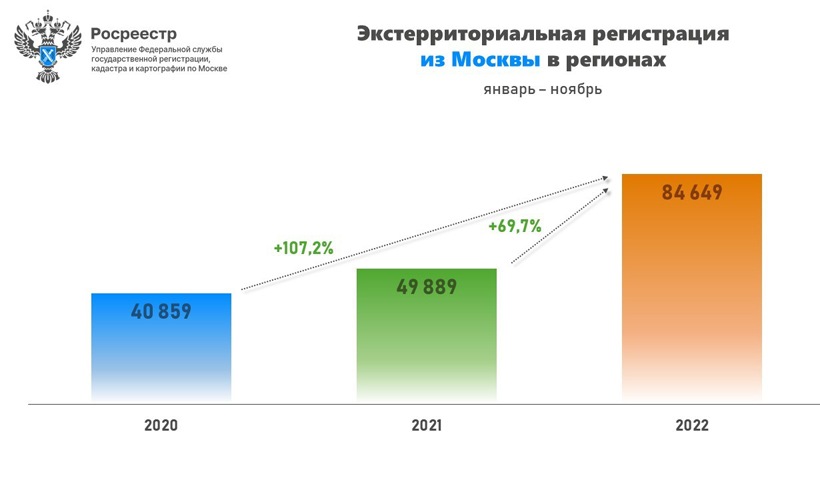 В январе-ноябре оформлено 84,6 тыс. заявлений жителей столица на регистрацию недвижимости в других субъектах РФ. Это на 69,7% больше, чем в январе-ноябре 2021-го (49,8 тыс.)