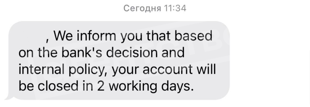 Детали. Судя по рассказам пяти собеседников «Агентства», они все получили однотипные сообщения от службы поддержки банка: «Мы сообщаем вам, что, согласно решению банка и внутренним правилам [банка], ваш счет будет закрыт в течение двух [в некоторых случаях — пяти] рабочих дней».