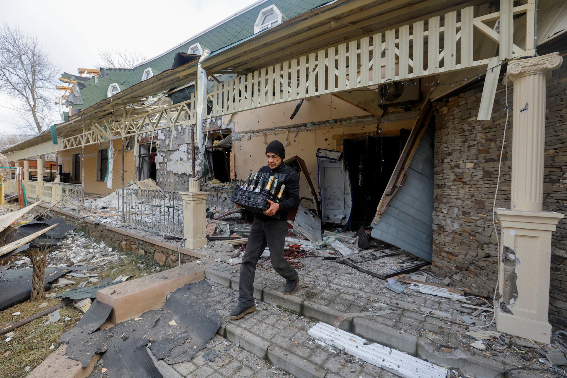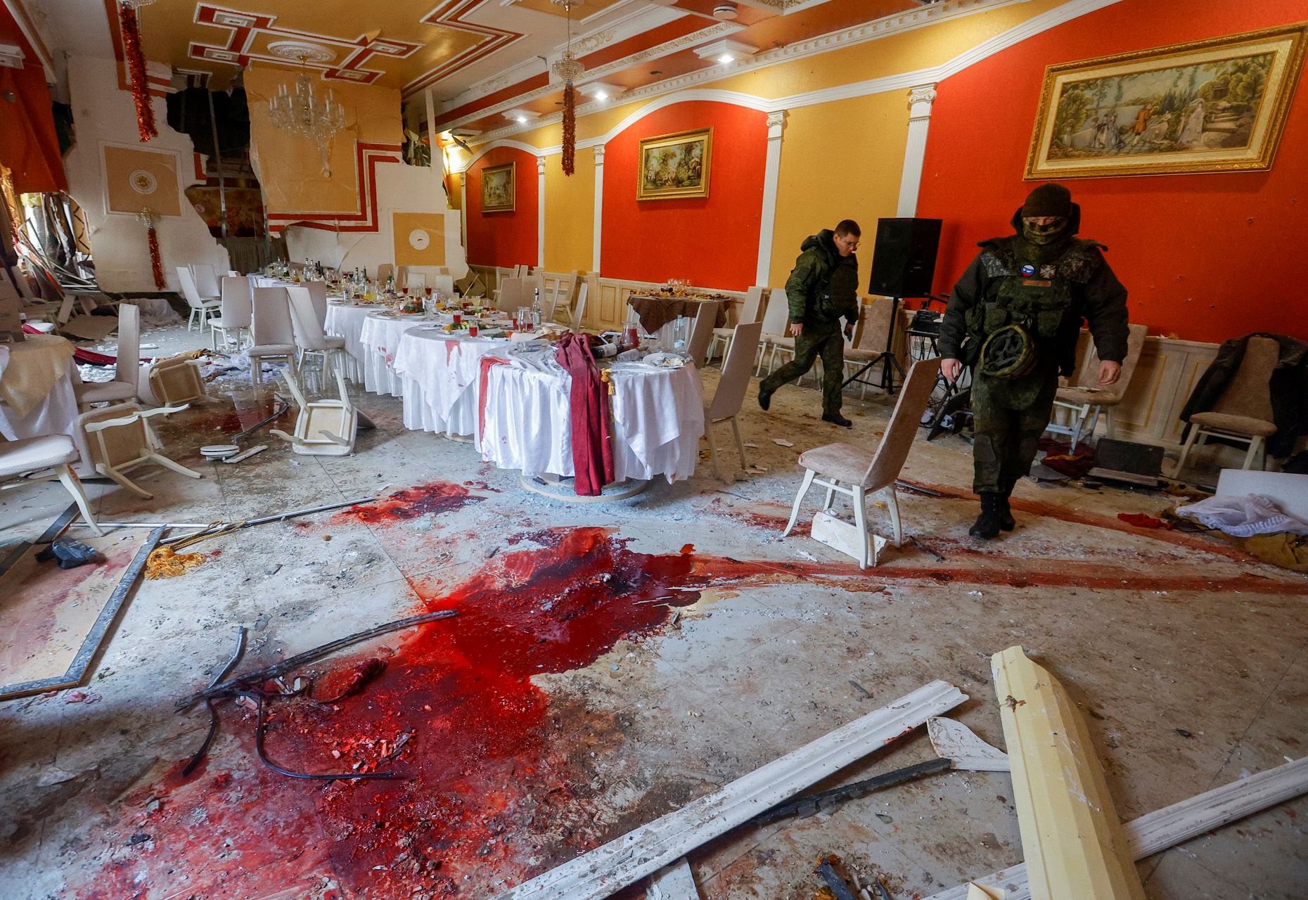 Alexander Ermochenko / Reuters / Scanpix / LETA Помещение ресторана «Шеш-Беш» в гостинице в Донецке, где был ранен Дмитрий Рогозин. По данным местных властей, в результате обстрела погибли два человекаAlexander Ermochenko / Reuters / Scanpix / LETA Мужчина выносит ящик с бутылками шампанского из разрушенного ресторана «Шеш-Беш». По сообщениям донецких телеграм-каналов, на которые ссылается Baza, здание обстреляли снарядами 155 калибра — это стандарт НАТО