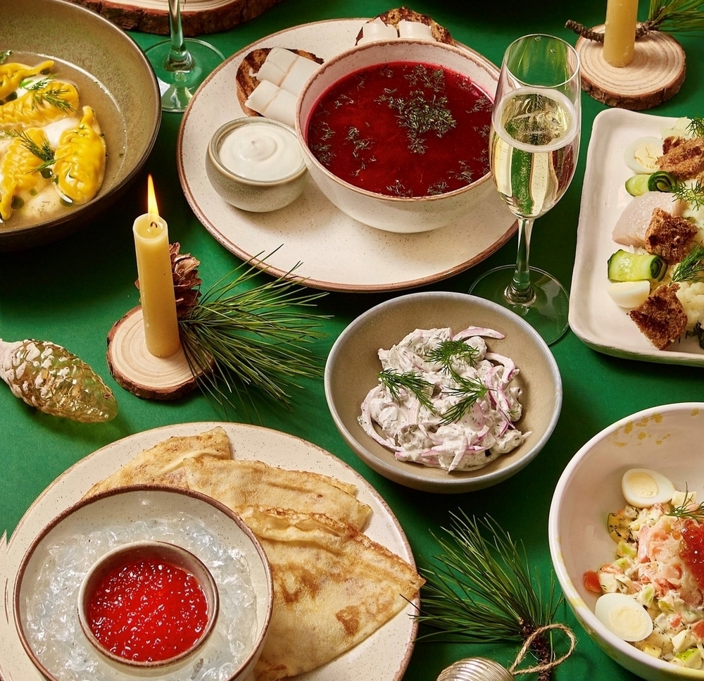 Ресторан в «Ленинград Центре» готовит селедку под шубой из редкого и ценного вида рыбы — черноспинной сельди Волго-Каспийского бассейна, которую также называют каспийским заломом. Заведение предлагает также оливье с колбасой и красной икрой или томленую баранью ногу. В разделе новогоднего меню собрали замороженные лепные блюда: например, пельмени с томлеными бычьими хвостами и вареники с манго.