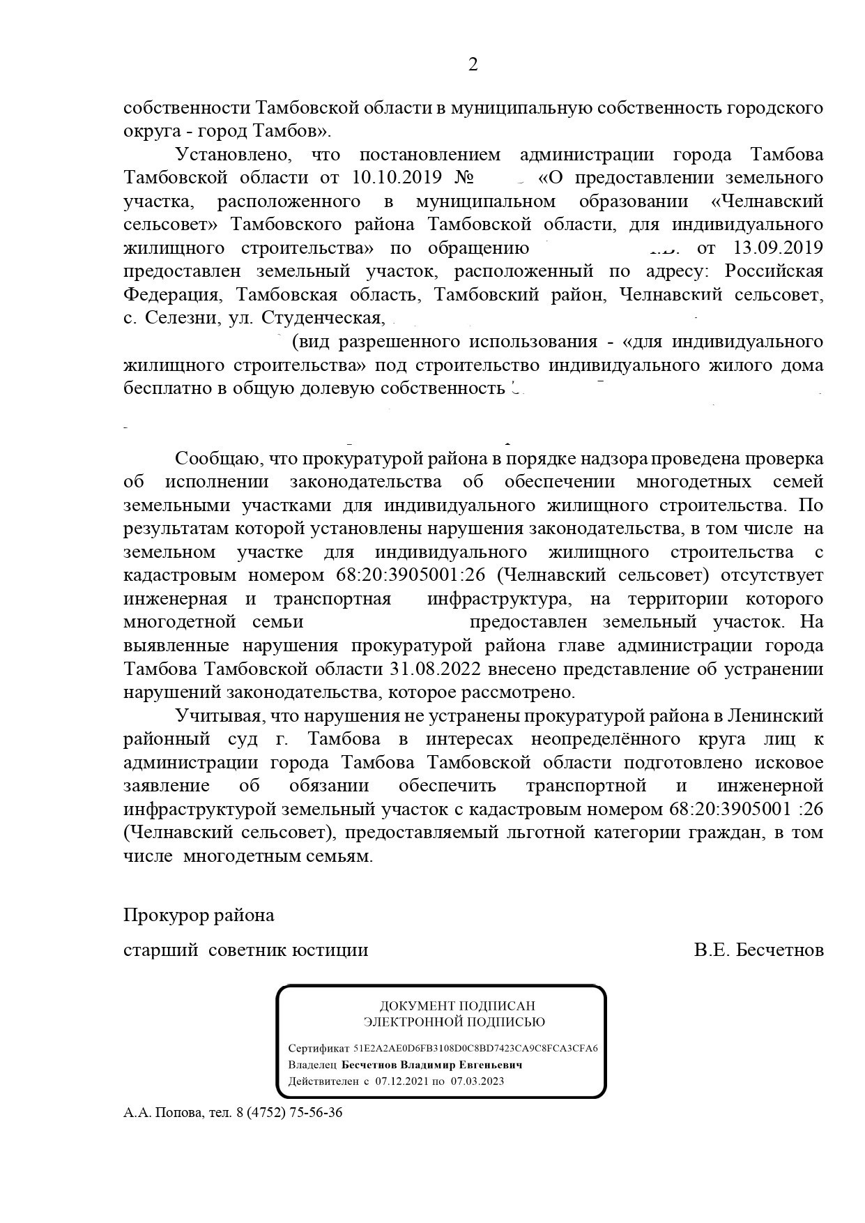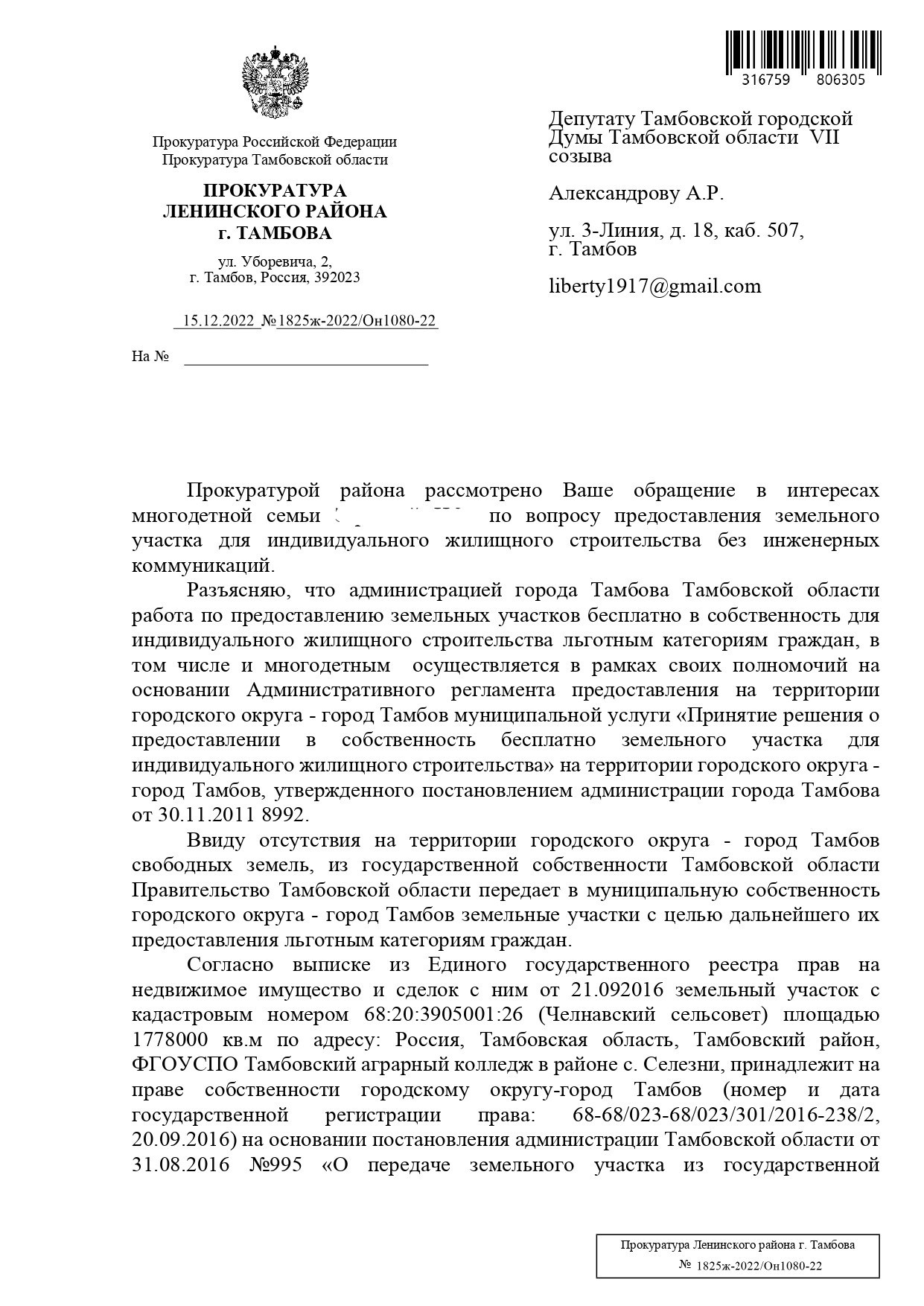 Прокуратура встала на защиту граждан, подготовлено исковое заявление об обязании администрации Тамбова обеспечить транспортной и инженерной инфраструктурой земельный участок, предоставляемый льготной категории граждан. Надеюсь, что вопрос разрешится в интересах граждан как можно оперативнее.