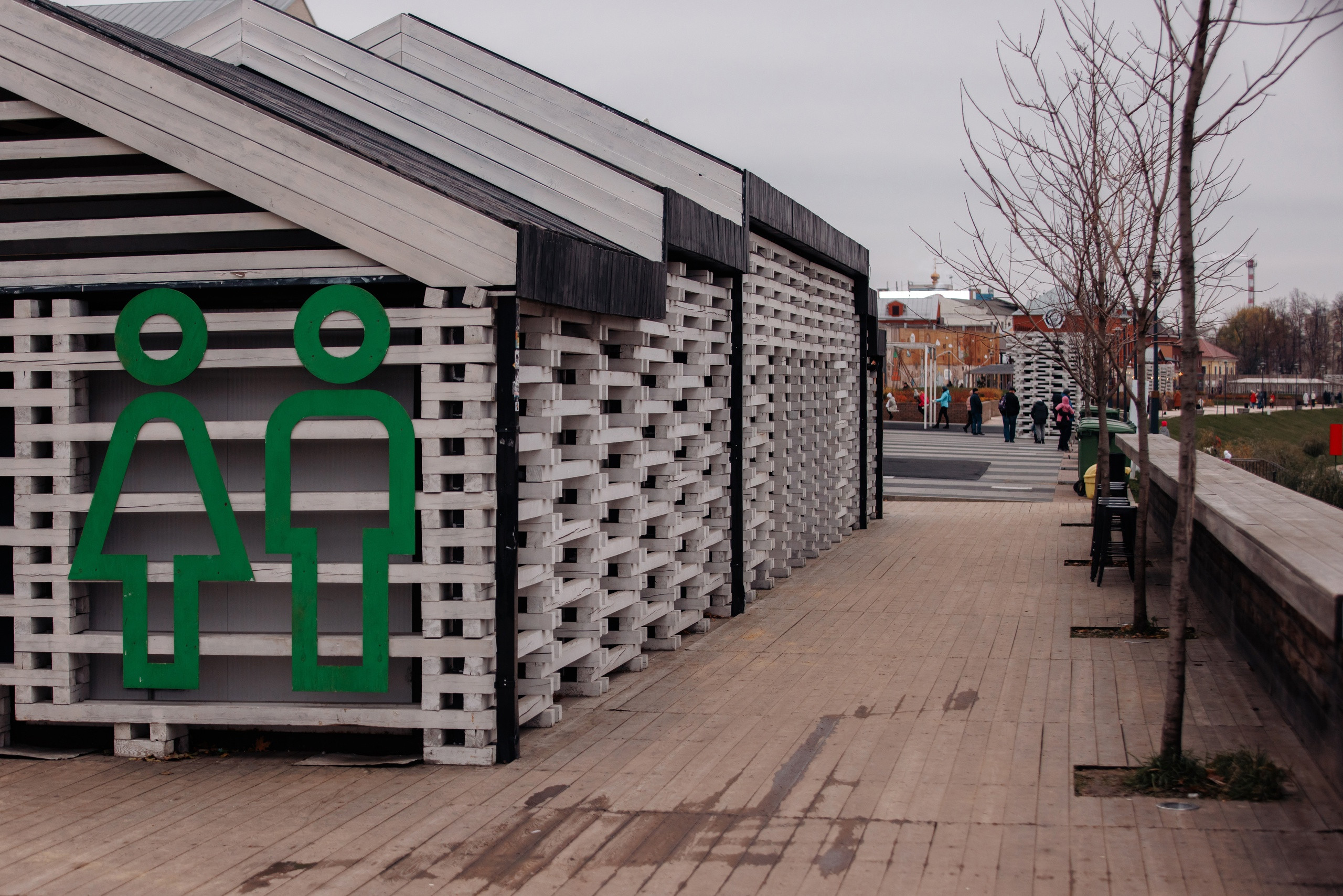 Общественные туалеты снаружи оформлены стильно, это не вагончики из синего пластика, измазанные и изрисованные всяким, хоть внутри не очень от них отличаются. Визуал не страдает, а рядом еще киоски-павильоны с кофейком, креслами и тыды…