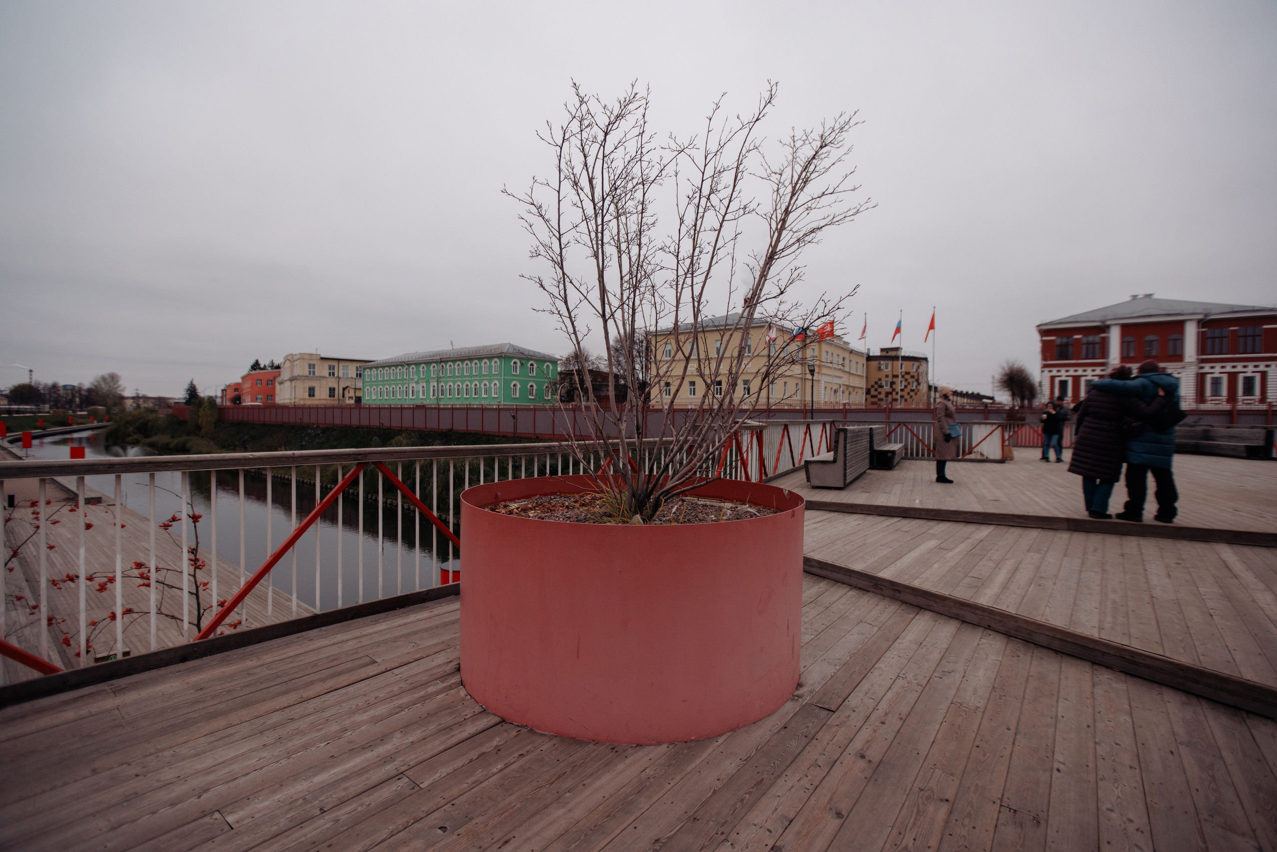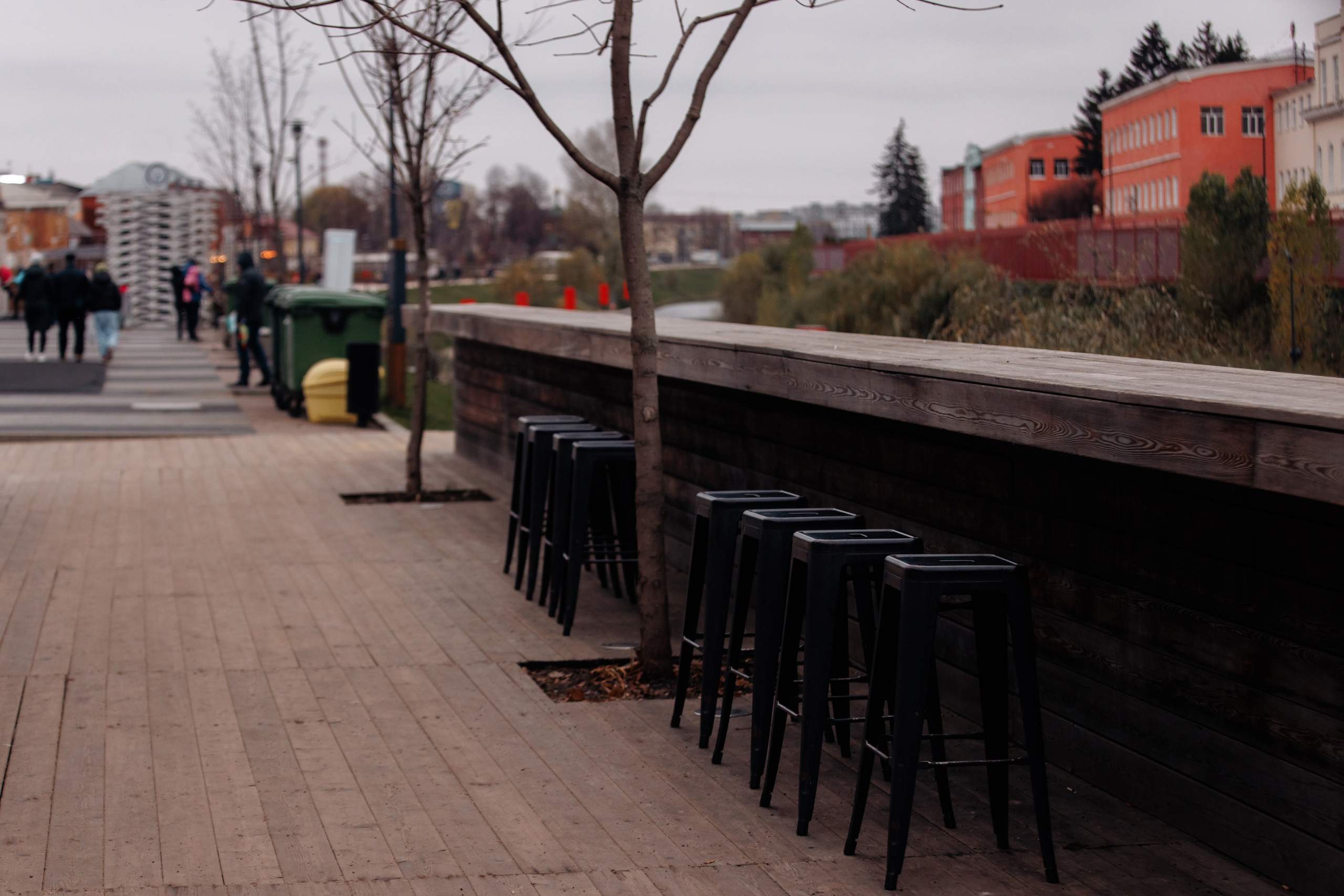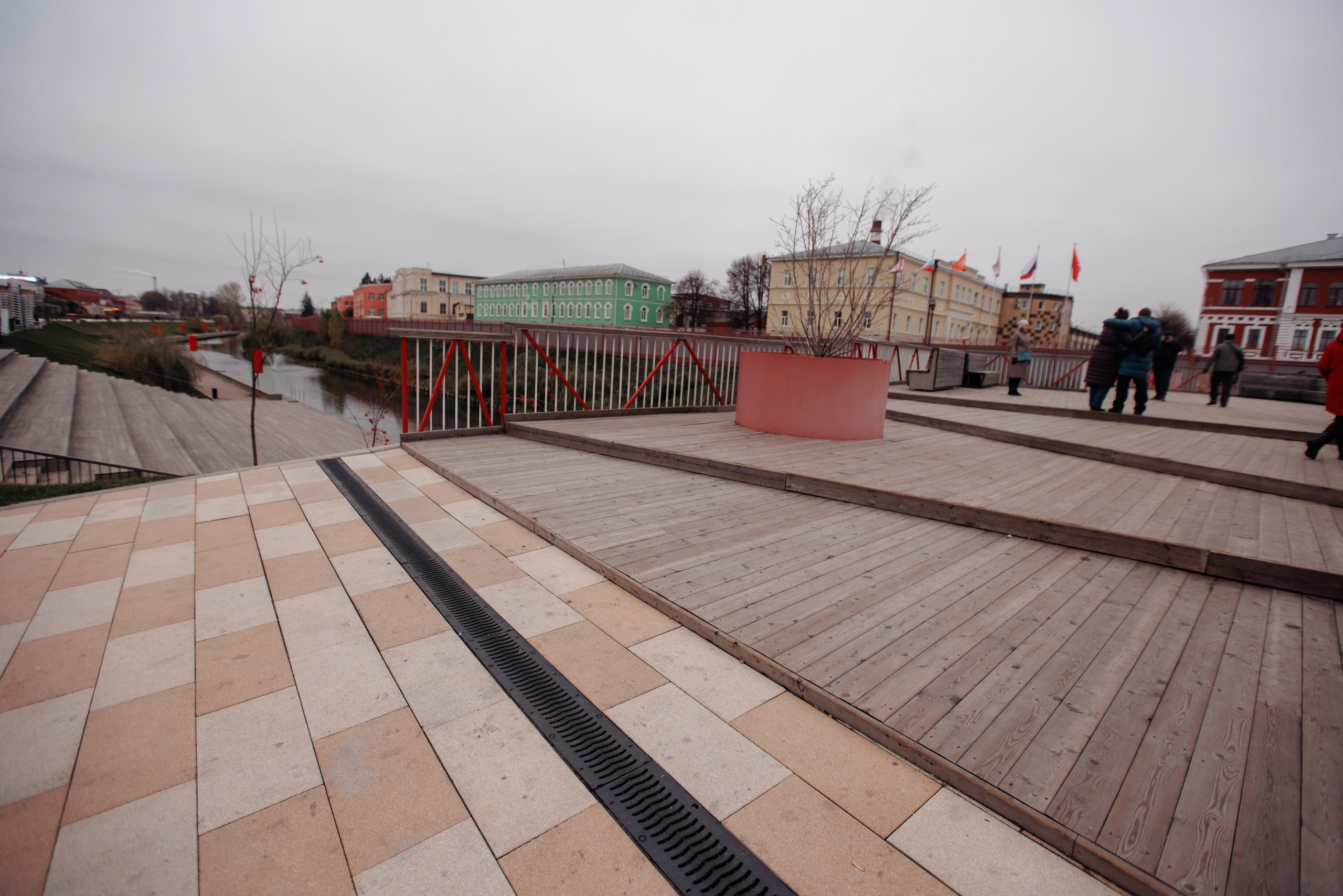 Стиль. Тут достаточно просто взглянуть на фото, визуал строг, уместно сочетается с окрестными пейзажами и кремлем, да и просто чертовски круто выглядит. На заметку тем, кто решительно против использования дерева как материала для благоустройства. Пока вы выступаете с аргументами "да там все сгниет в нашем климате", в нашем климате появляются примеры крутоты, которая не вызывает отторжения даже угрюмой голой ноябрьской осенью.
