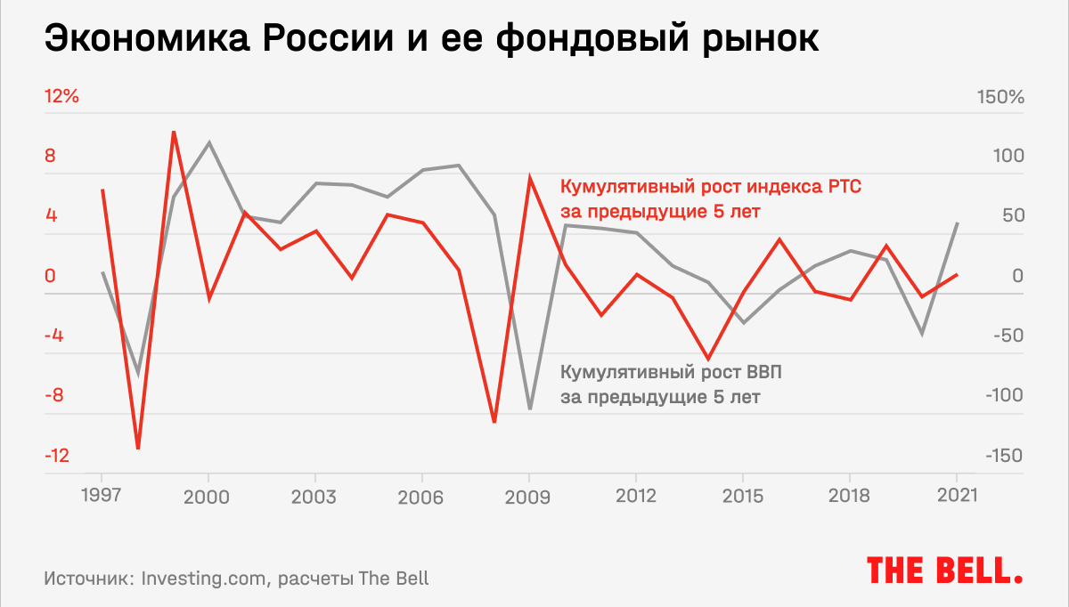 Динамика российского фондового рынка начиная с 2000 года также довольно сильно повторяет динамику ВВП: коэффициент корреляции пятилетних средних показателей роста ВВП и индекса РТС, по подсчетам The Bell, составляет 0,71, что говорит о высокой степени зависимости. В 2012–2021 годах среднегодовой темп роста ВВП РФ составил 1,35%. Индекс РТС за то же время рос в среднем на 4,8% в год, но в 2022-м весь этот рост был съеден. Из-за начатой Владимиром Путиным войны в Украине падение экономики, по последнему прогнозу МВФ, составит 3,4%. В 2023 экономика должна упасть еще на 2,3%. Если прогнозы сбудутся, средние темпы роста упадут до 0,65%.