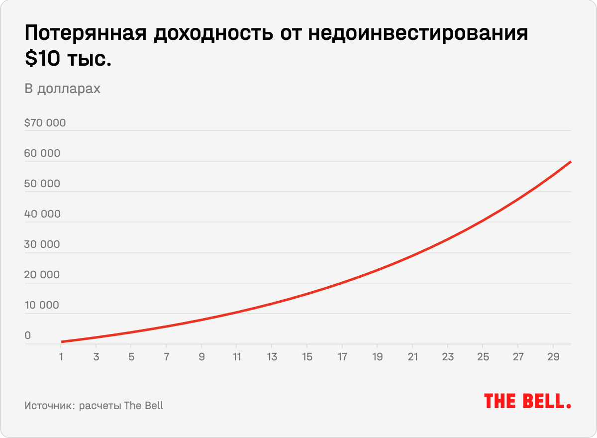 Для инвесторов закрытие свободного доступа на американский рынок означает снижение возможностей накопления капитала. Упущенную выгоду легко посчитать. Если взять за основу посчитанную Credit Suisse реальную среднегодовую доходность S&P 500 в 6,7%, выходит, что при стартовом капитале $10 тысяч за 10 лет инвестор недосчитается $9,1 тысячи, или те самые 90% капитала. За 20 лет упущенная выгода составит $36,6 тысячи, за 30 — $60 тысяч.