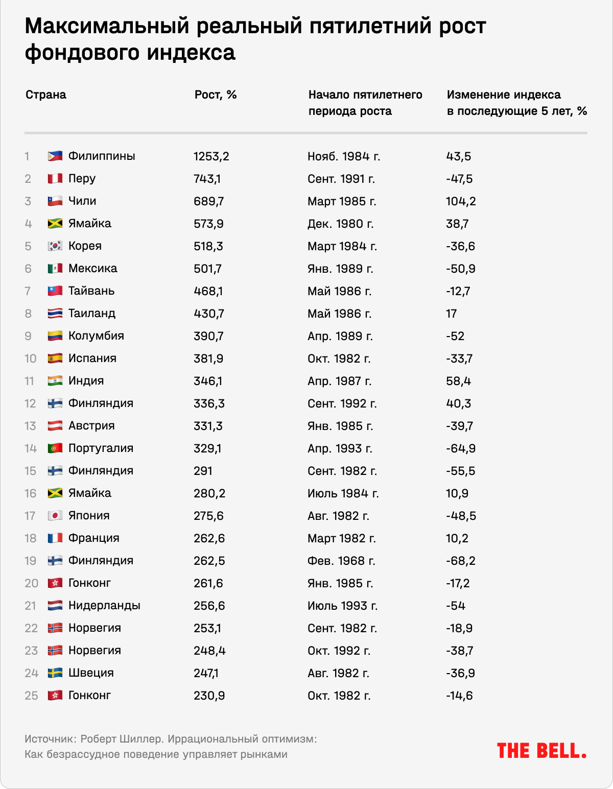 Развивающиеся рынки, к которым относится и российский, иногда действительно преподносят сюрпризы. Нобелевский лауреат по экономике Роберт Шиллер в своей книге «Иррациональный оптимизм», вышедшей в 2000 году, собрал случаи максимального пятилетнего роста на них.