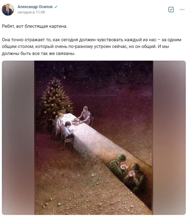 «Ребят, вот блестящая картина. Она точно отражает то, как сегодня должен чувствовать каждый из нас, — за одним общим столом, который очень по-разному устроен сейчас, но он общий. И мы должны быть все так же связаны», — написал забайкальский губернатор-единоросс Осипов во «ВКонтакте».