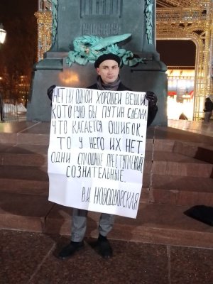Дата25.12.2022АвторСкрытИсточникОВД-ИнфоСохранённая копияInternet ArchiveOriginal MaterialShow translationВ Москве задержали мужчину с плакатом, на котором была цитата Новодворской о Путине Фотография предоставлена свидетелем задержания