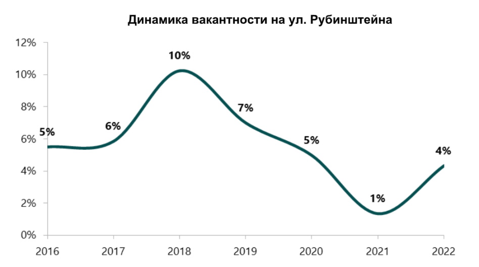 - За год доля свободных помещений на улице Рубинштейна выросла с 1 % до 4 %. В следующем году возможен дальнейший рост этого показателя.