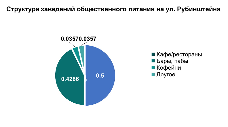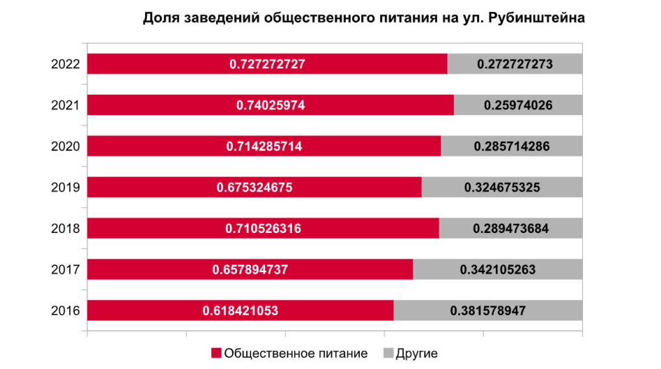 - Несмотря на закрытия этого года, кафе, рестораны и бары занимают 73 % от всех торговых площадей на Рубинштейна — по данным NF Group, к началу декабря на улице работали 56 заведений общественного питания. Этот показатель был выше только в 2021 году, тогда он составлял 74 %