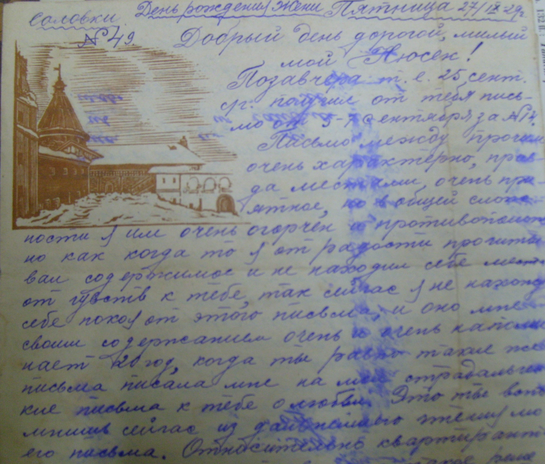 – Эти письма представляют особую художественную ценность, – поясняет Савченко. – Это единственные известные мне письма, написанные на "фирменной" соловецкой бумаге с художественным оформлением. На каждом послании есть рисунок с видами островов. С уверенностью можно сказать, что эти 11 рисунков (в письмах они повторяются) выполнены художником, выходцем из Латвии Иваном Петровичем Недритом. На них и открытках есть характерный слитный знак из букв "И" и "Н". На его гравюрах по дереву - виды башен и церквей старинного Соловецкого монастыря, названного при советской власти "кремлем".
