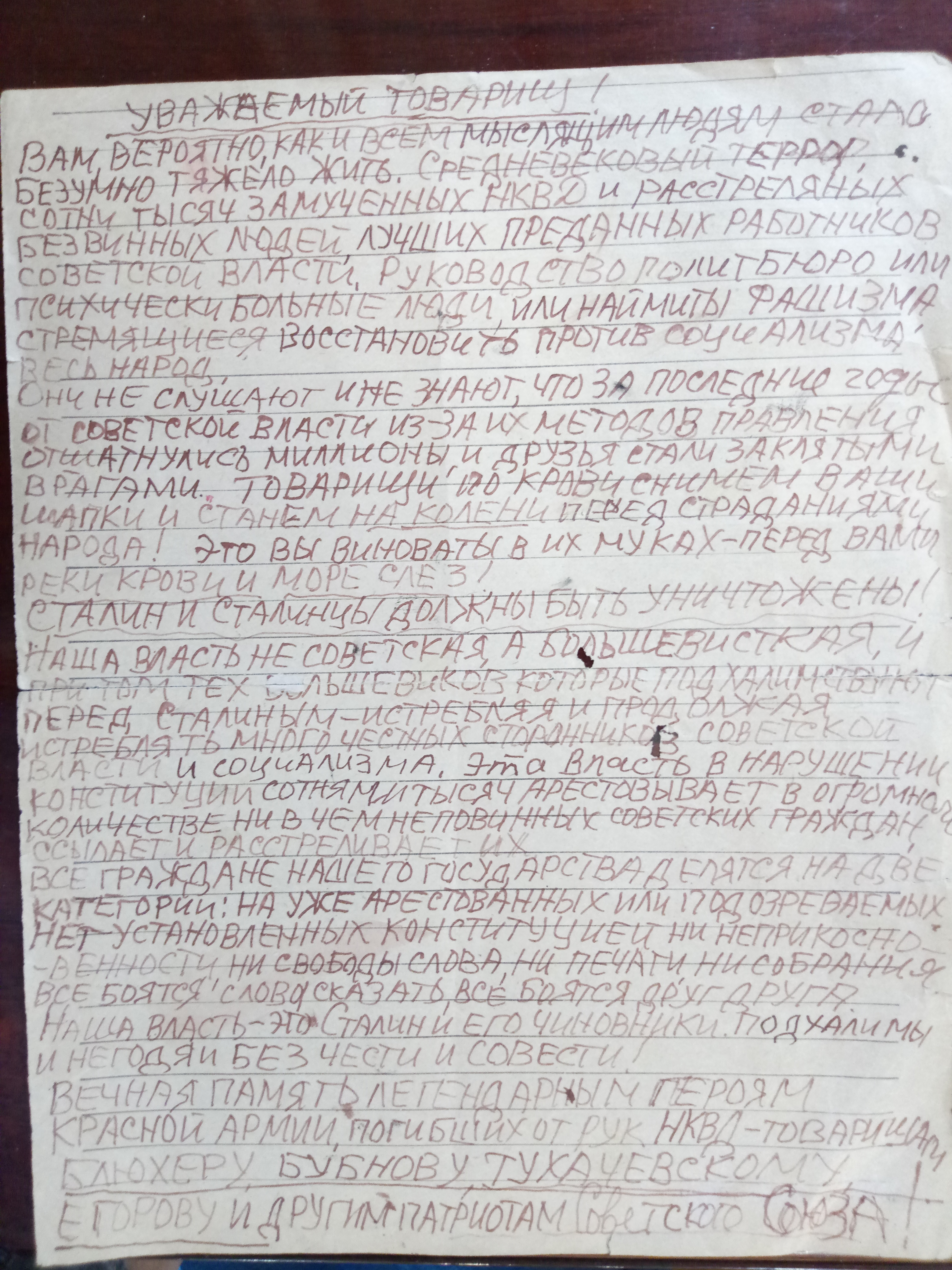 "Средневековый террор, сотни тысяч замученных НКВД и расстрелянных невинных людей; лучших преданных работников советской власти. Руководство Политбюро или психически больные люди, или наймиты фашизма, стремящиеся восстановить против социализма весь народ… Сталин и сталинцы должны быть уничтожены…Эта власть, в нарушение конституции, сотнями тысяч арестовывает в огромных количествах ни в чем не повинных советских граждан, ссылает и расстреливает их… Все граждане нашего государства делятся на две категории: на уже арестованных или подозреваемых…Нет, установленных конституцией, ни неприкосновенности, ни свободы слова, ни печати, ни собрания. Все боятся слова сказать, все боятся друг друга… Наша власть – это Сталин и его чиновники. Подхалимы и негодяи без чести и совести".