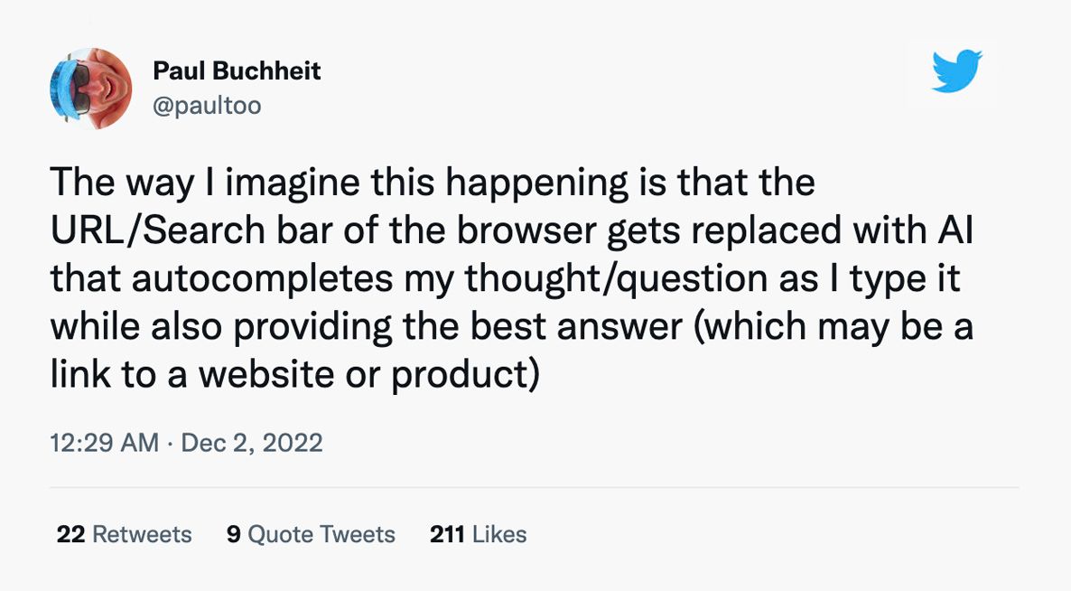 Создатель Gmail Пол Букхайт: «Я вижу это так: URL-строку или поле поиска в браузере заменяет [чат-бот] ИИ, который дополняет мою мысль/вопрос по мере печати, а еще представляет лучший ответ, что может быть ссылкой на сайт или продукт»