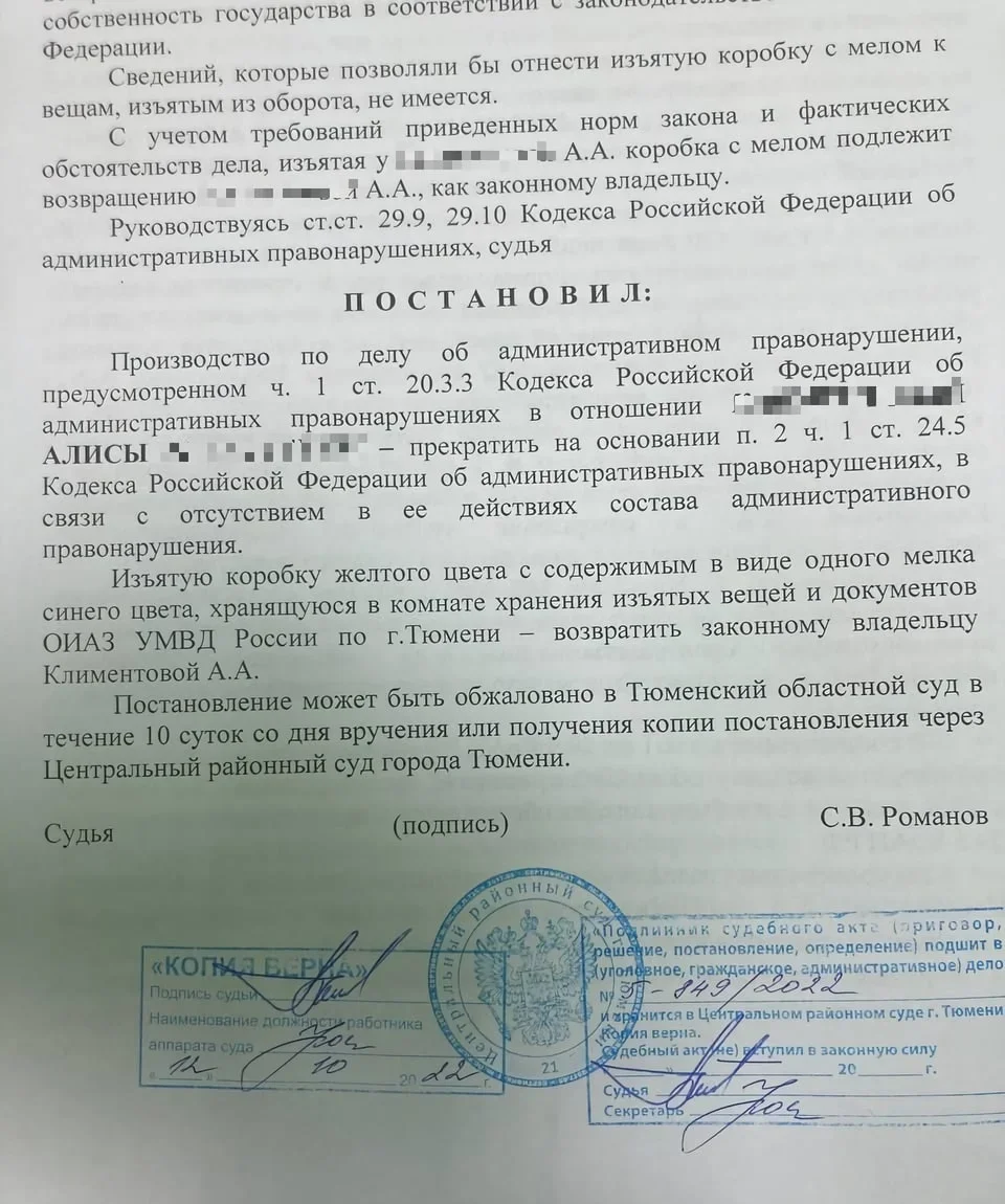 Неожиданно судья Центрального районного суда Тюмени Сергей Романов согласился с доводами обвиняемой и постановил, что в действиях девушки не было правонарушения. И закрыл дело. А еще постановил вернуть законному владельцу — то есть невиновной Алисе —изъятое у нее орудие правонарушения. «Коробку желтого цвета с содержимым в виде одного мелка синего цвета». «Я сказала полиции первое, что пришло в голову. Полагаю, что это везение и лояльное отношение сотрудников и судьи. То есть человек профессионально сработал», — поделилась Алиса с изданием «Сибирь.Реалии» (внесено Минюстом в реестр иностранных агентов. — Ред.).