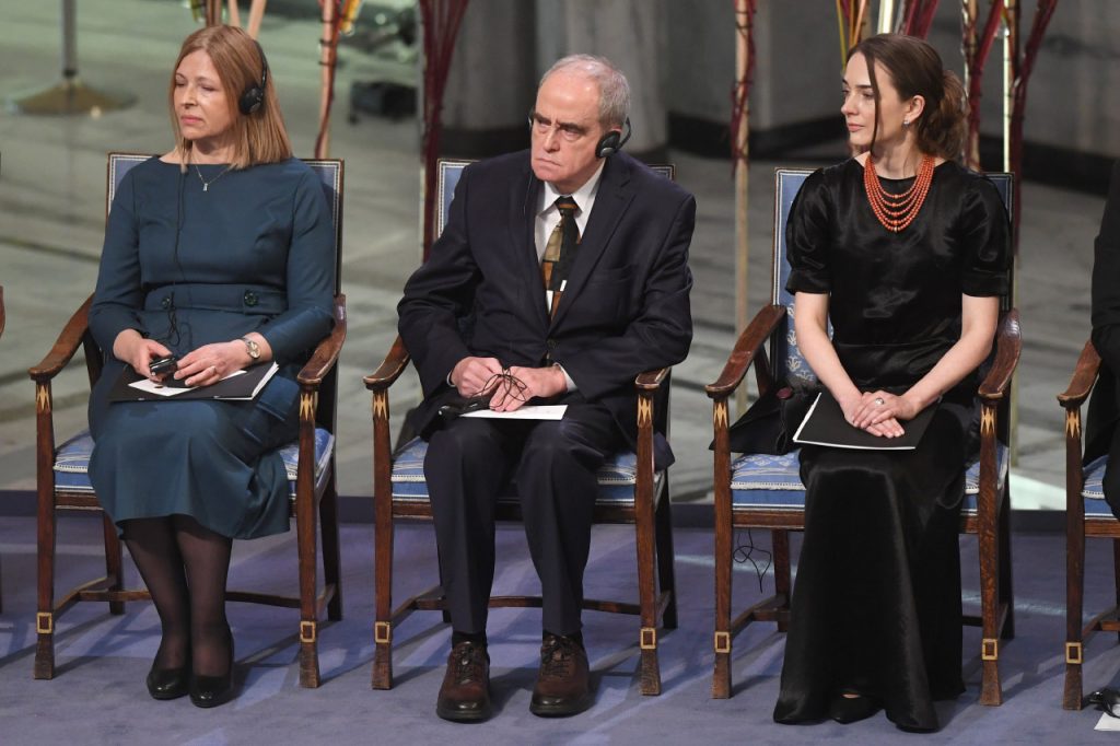 Белоруска Наталья Пинчук (жена лауреата Нобелевской премии 2022 года Алеся Беляцкого, который находится в минском СИЗО, россиянин Ян Рачинский (глава «Мемориала») и украинка Александра Матвейчук (руководитель «Центра гражданских свобод» ) на вручении Нобелевской премии мира в Осло. 10 декабря 2022 года. Фото: Paul Treadway / UPI / Shutterstock / Vida Press