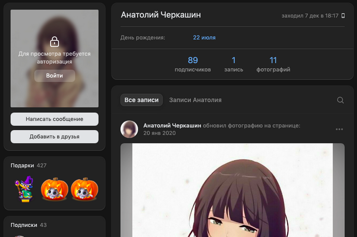 На странице Черкашина во «ВКонтакте» нет личных фотографий, только подписки на более чем 40 пабликов про аниме.