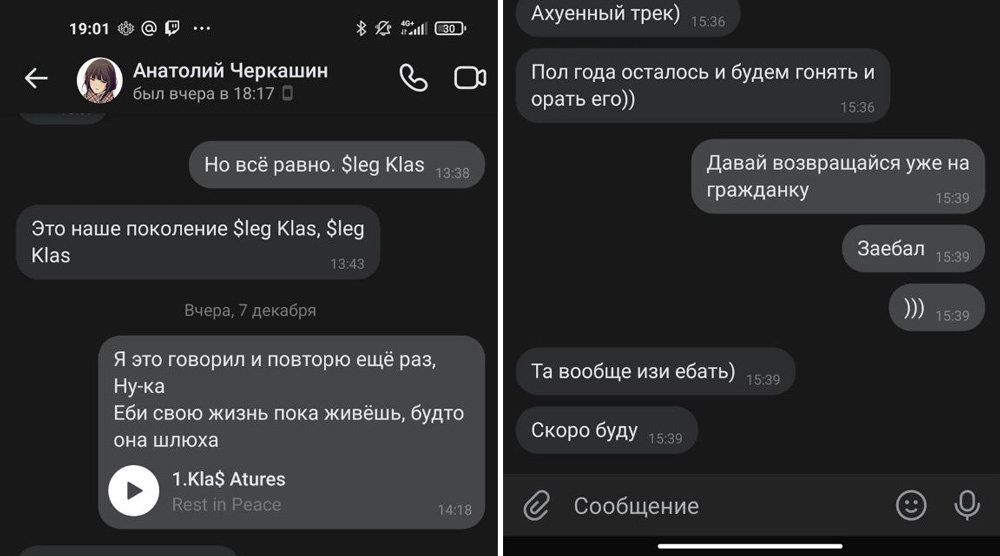 «Я это говорил и повторю еще раз, ну-ка. Еби свою жизнь, пока живешь, будто она шлюха», — написал друг Анатолия в переписке. Это цитата из трека Rest in Peace рэпера 1 Kla$, которого молодые люди обсуждали ранее, называя его «нашим поколением».