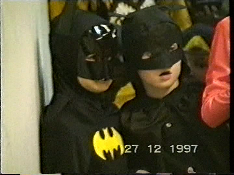 Творческая интеллигенция — народ особый: у нее и фантазия позаковыристее, и руки в плане ИЗО растут если не прям откуда надо, то хотя бы затейливо. В толпе детей на старой пленке можно заметить идеально квадратного робота, похожего на механического зайца из 14-го выпуска «Ну, погоди!», бледнолицего вурдалака с нарисованной щетиной, призрака в лохмотьях и сразу двух Бэтменов с помятыми ушами и обалдевшими лицами. Им было от чего обалдеть.
