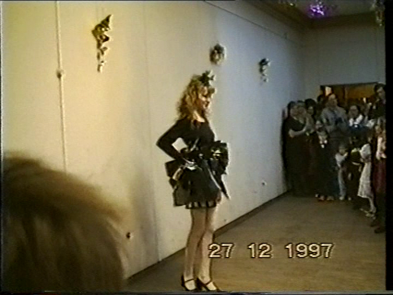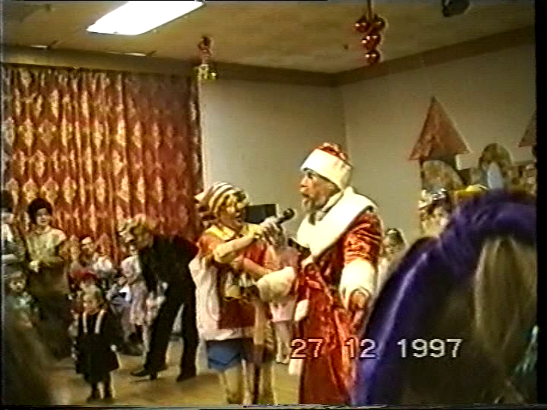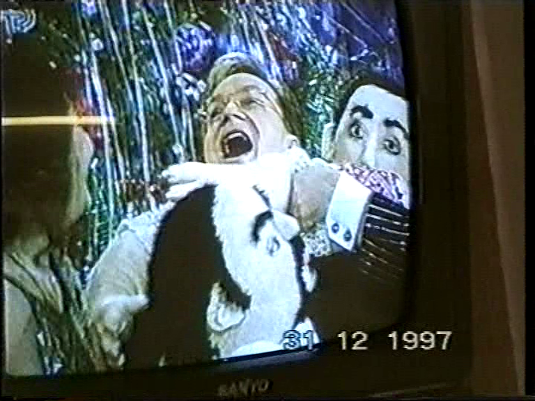 31 декабря 1997 года, снимая на камеру телевизор и переключая каналы, папа пролистывает фильмы «Ирония судьбы, или С легким паром!» и «Иван Васильевич меняет профессию», останавливая выбор на канале РТР. Еще бы: там главного тогдашнего шоумена «второй кнопки», Игоря Угольникова, душил кукольный кабаре-дуэт «Академия» — плюшевые Лолита Милявская и Александр Цекало.