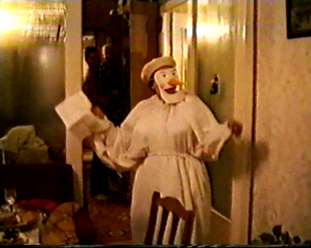 Передав камеру маме, отец сам появляется в кадре, чтобы спародировать типичное появление на ТВ рядового советского гражданина начала 1990-х. Сначала, опустив глаза вниз, он робко бормочет, что прошедший год был «ничего», а затем, «заметив» камеру, пугается и громко объявляет: «У нас все хорошо, слава КПСС, ура!»