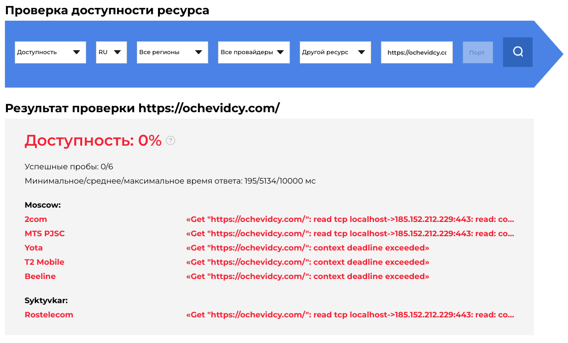 Реестр Роскомнадзора подтверждает информацию о блокировке. При этом ведомство не уточнило, по требованию какого органа сайт был заблокирован. По данным сервиса GlobalCheck, все операторы уже ограничили доступ к домену «Очевидцев». Мучник сказал, что проект продолжит публиковать материалы в соцсетях.