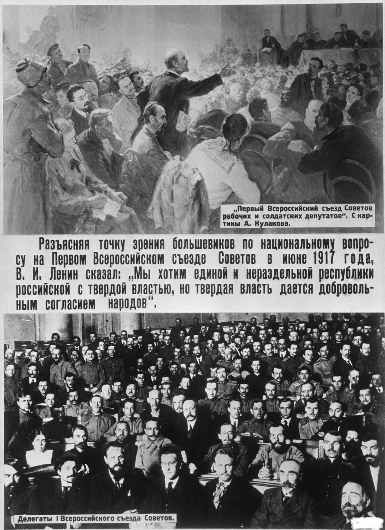 Такие советы создавались во всех крупных городах России весной-осенью 1917 года. Чтобы координировать их работу и подчинить ее общей логике, в июле 1917-го созвали первый Всероссийский Съезд Советов. Большевики на нем присутствовали, но точно не главенствовали; решающая сила была у других социалистических партий — меньшевиков и эсеров. А вот уже второй Съезд советов в ноябре 1917 года утвердил захват большевиками власти, принял их основные декреты — «О земле» и «О мире» — и заявил о переходе власти в России к советам разных уровней (знаменитый лозунг «Вся власть Советам!»).