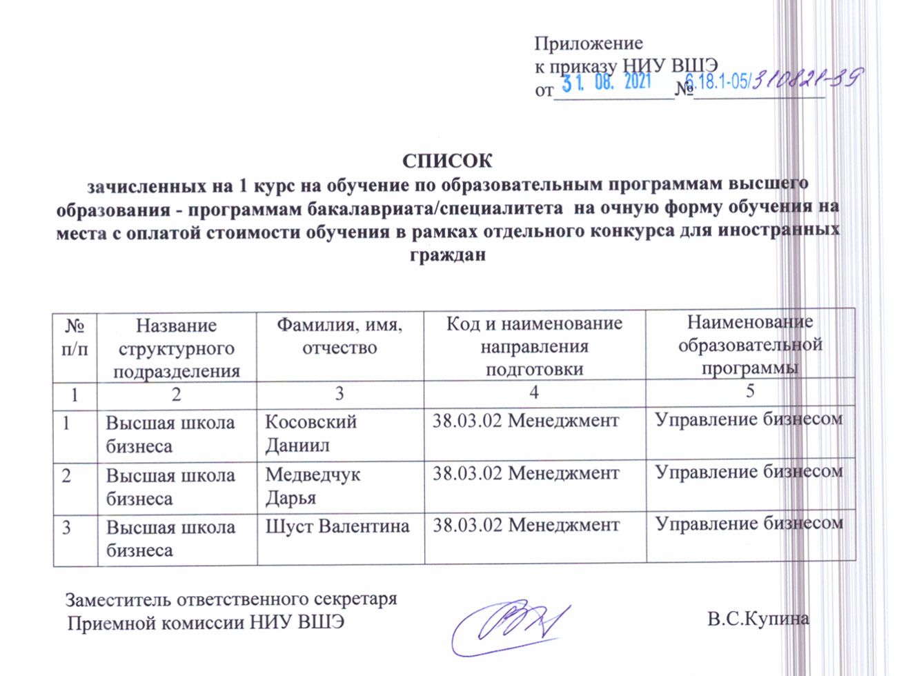Дарья Медведчук сейчас учится в Москве. Об этом «Медуза» и «Лаборатория университетской прозрачности» узнали из приказа о зачислении Медведчук и еще двух студентов на факультет «Высшая школа бизнеса» Высшей школы экономики (ВШЭ) от 31 августа 2021 года, опубликованного на сайте вуза. Всех троих зачислили во ВШЭ на одну из самых востребованных специальностей факультета — «управление бизнесом» — по особой процедуре для иностранцев (они граждане Украины). Этот способ поступления дает возможность иностранным гражданам не сдавать ЕГЭ — вместо него нужно сдать внутренние вступительные экзамены вуза.