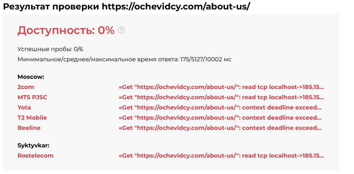 По данным Globalchek, доступность сайта составляет 0%. В Москве доступ ограничили 2com, MTS, Yota, T2 Mobile, Beeline.