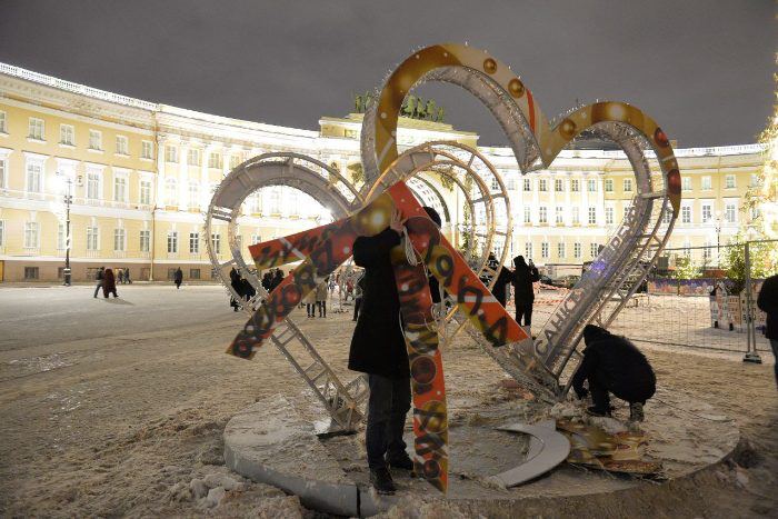 Инсталляция «Двойные сердца» появилась на Дворцовой площади 12 декабря. 18 декабря на ней заметили надпись, после чего конструкцию частично разобрали.