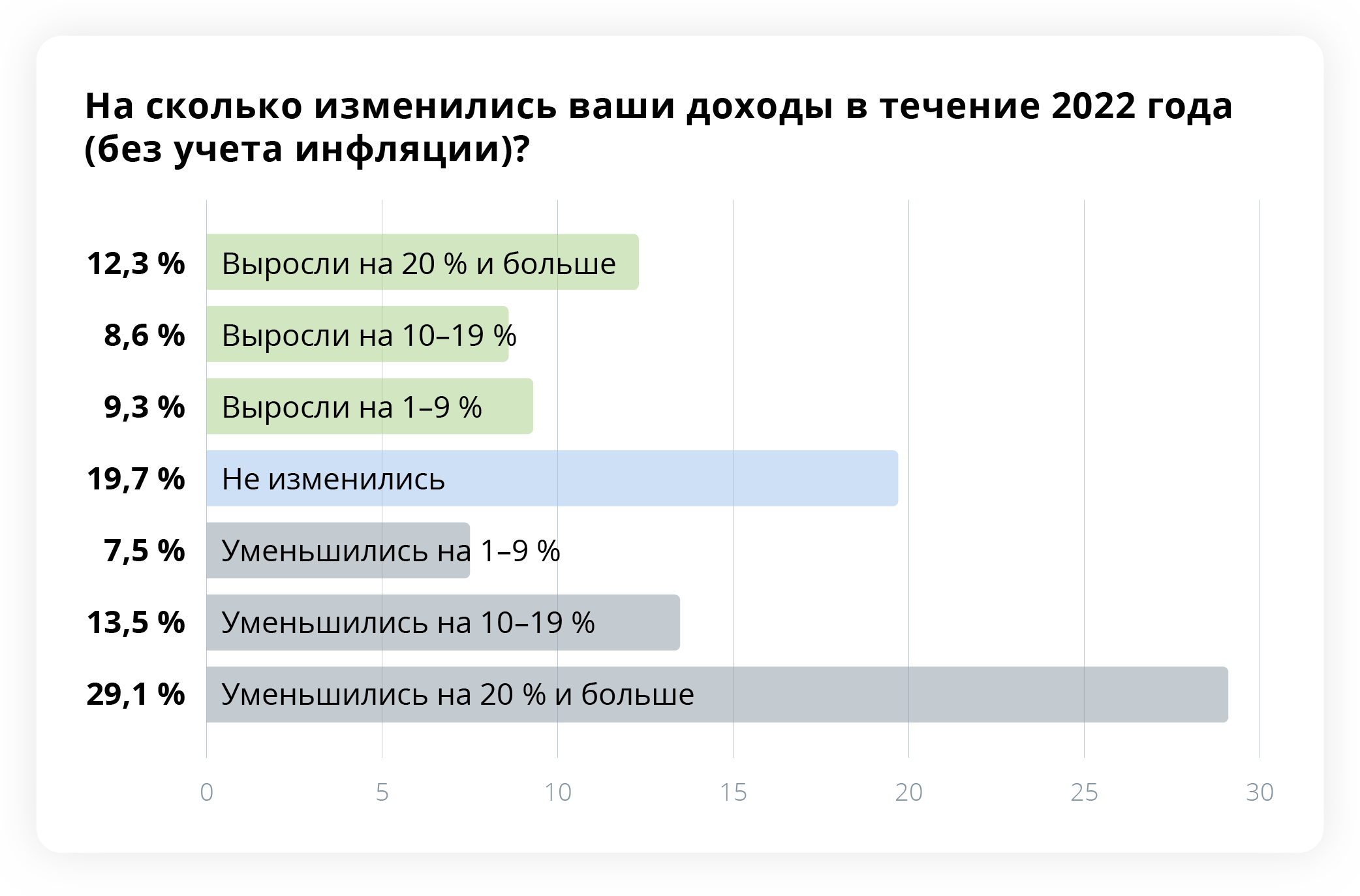 Почти треть прошедших опрос ответили, что в этом году их доходы упали на 20 % и более — и это без учета инфляции, то есть реальное падение еще больше. Еще у 21 % доходы сократились, но не так значительно.