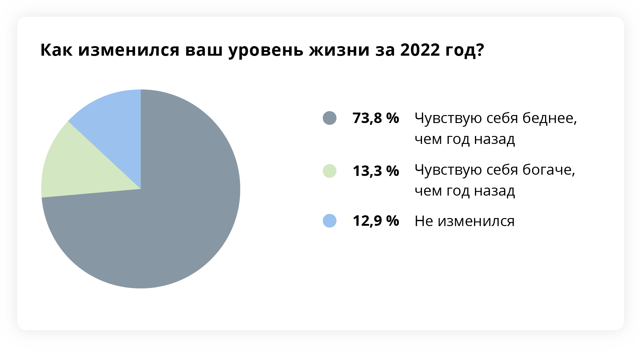 Но половина тех, чьи доходы в номинальном выражении выросли, всё равно чувствуют себя беднее, чем в 2021 году. Только по 13 % чувствуют себя богаче или так же.