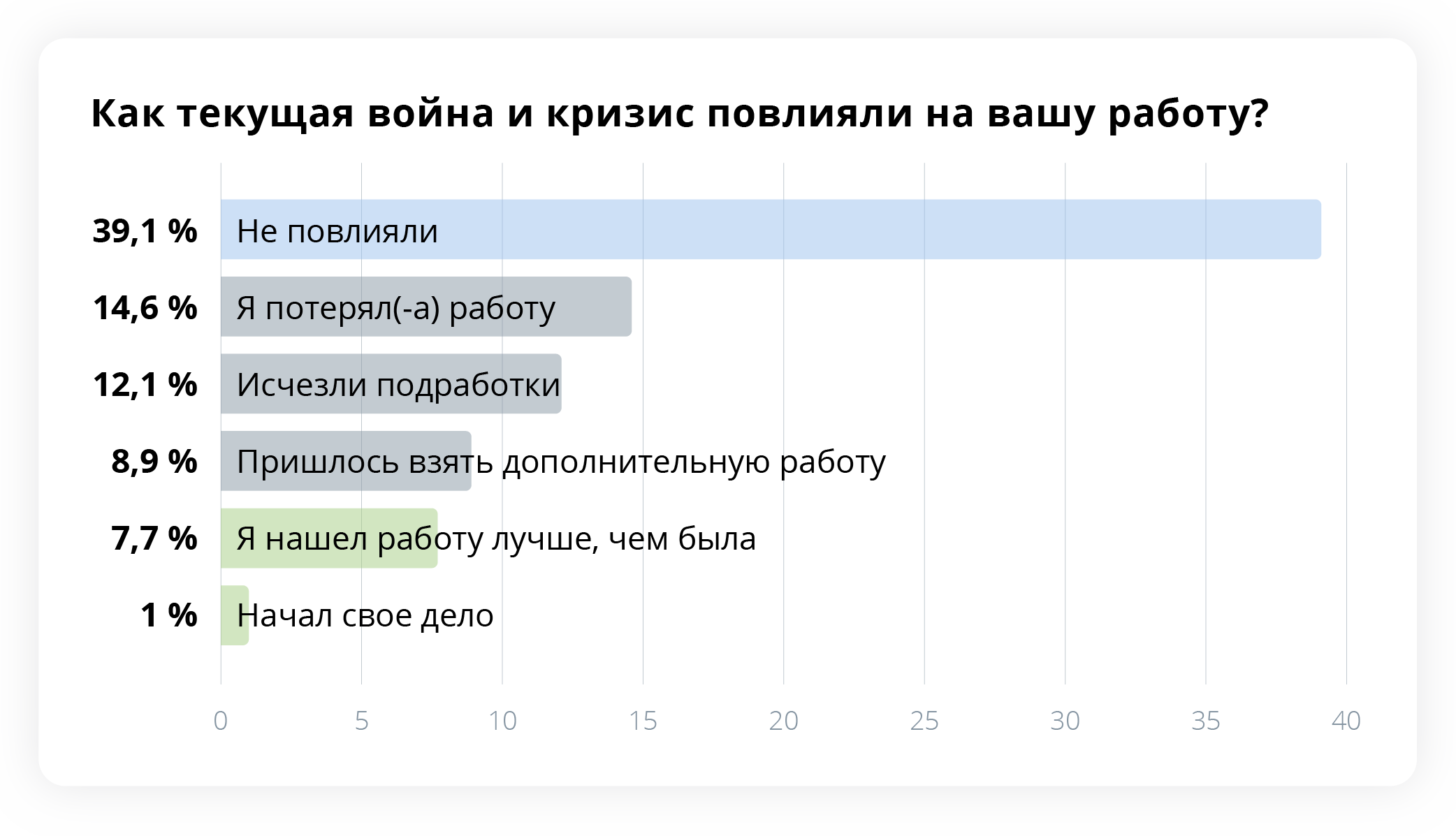 Похожее разделение на выигравших и проигравших актуально и для работы. Почти 15 % читателей ответили, что из-за войны и экономического кризиса потеряли работу, 12 % — что лишились подработок. В то же время почти 8 % благодаря войне и кризису нашли работу, которая лучше оплачивается или больше им подходит, а 1 % начал свое дело.