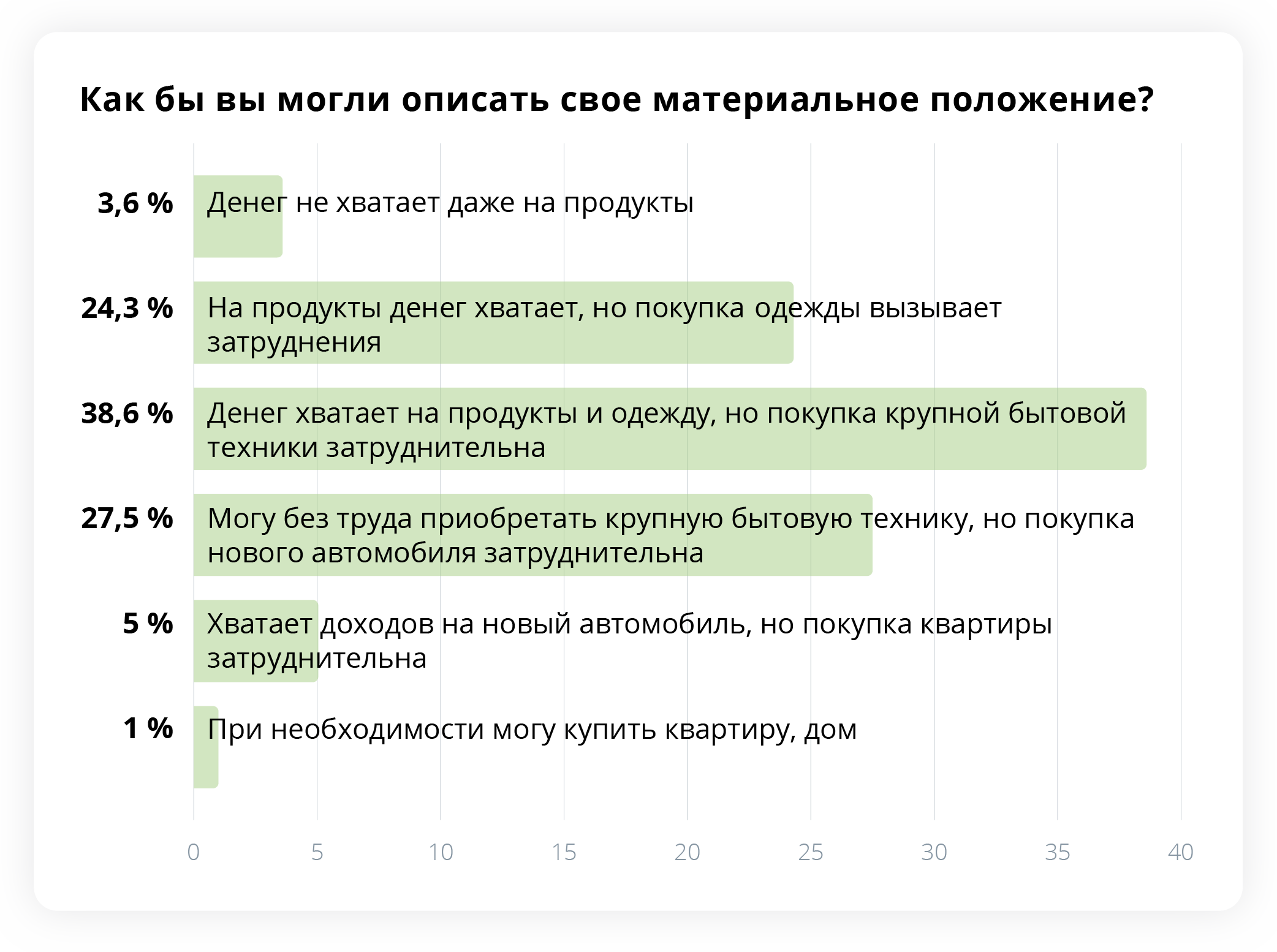 Среди участников опроса в декабре 2022 года стало больше тех, кому не хватает денег даже на питание, и тех, кому сложно покупать одежду. Тем не менее 5 % ответивших могут без проблем купить новый автомобиль, 1 % — квартиру и еще 28 % — холодильник или стиральную машину.