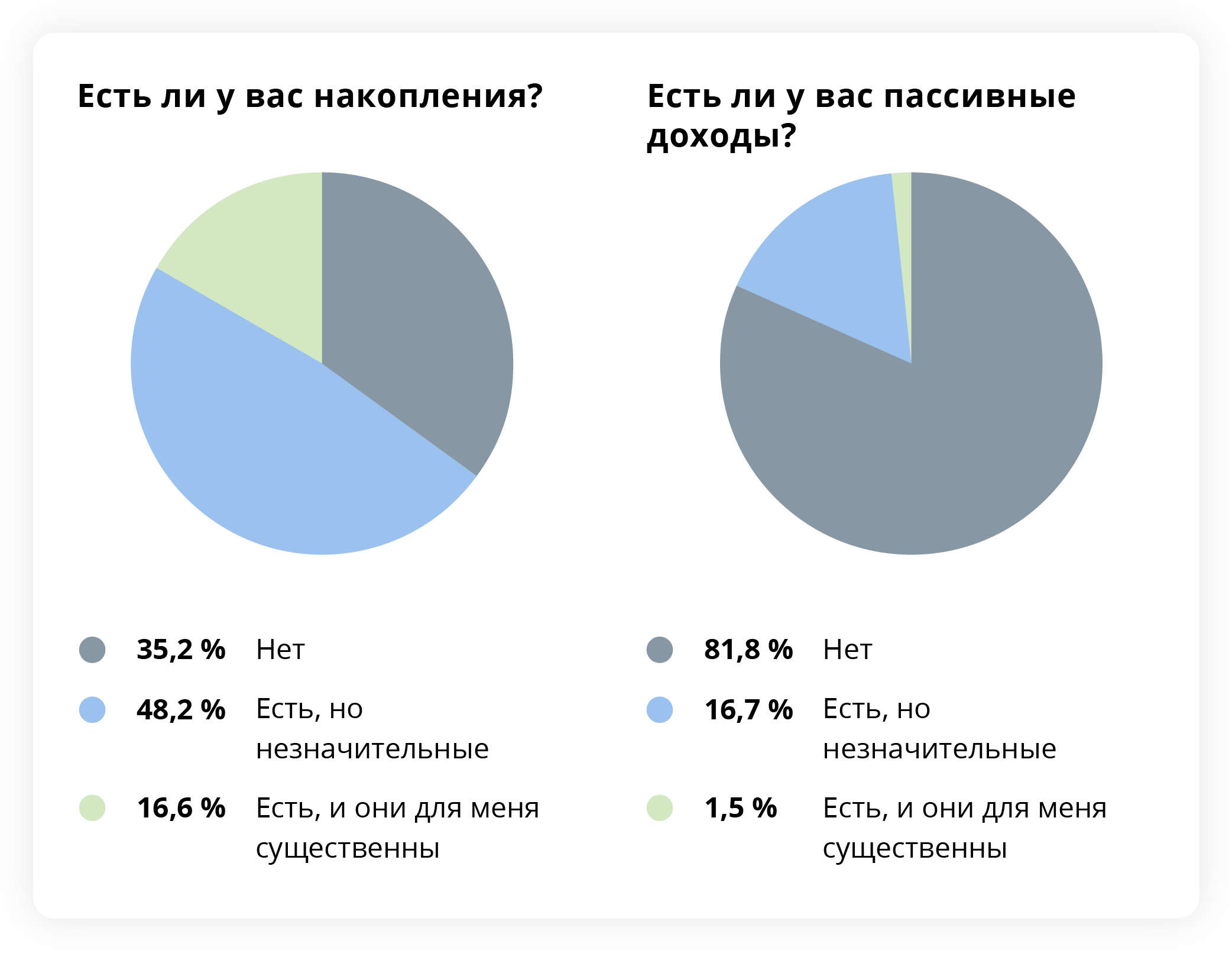 Сейчас накопления есть у большинства опрошенных, но только у 17 % они существенны. Значительные пассивные доходы — например, от сдачи квартиры — есть только у 1,5 % читателей.