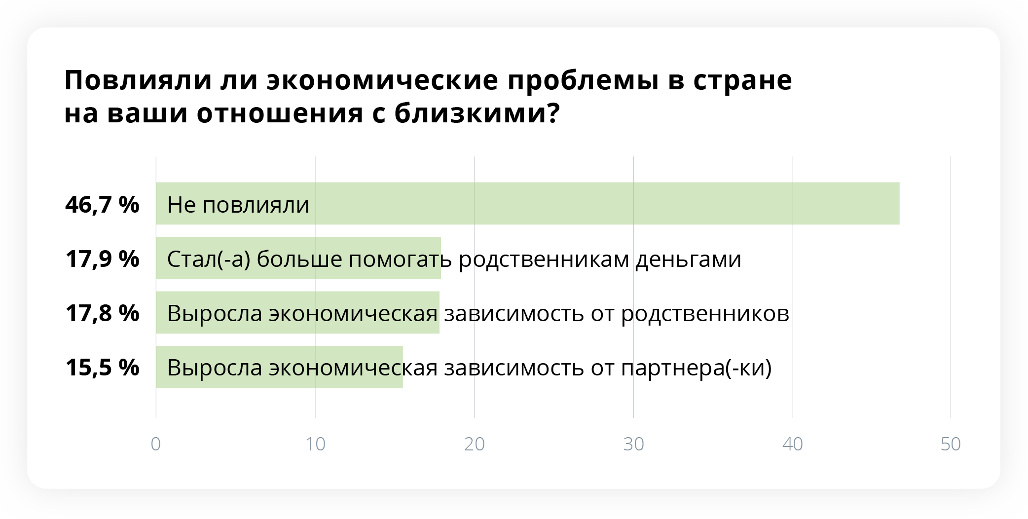18 % ответили, что в 2022 году стали больше помогать родственникам деньгами. Несколько человек написали, что из-за различий во взглядах с близкими потеряли их финансовую поддержку.